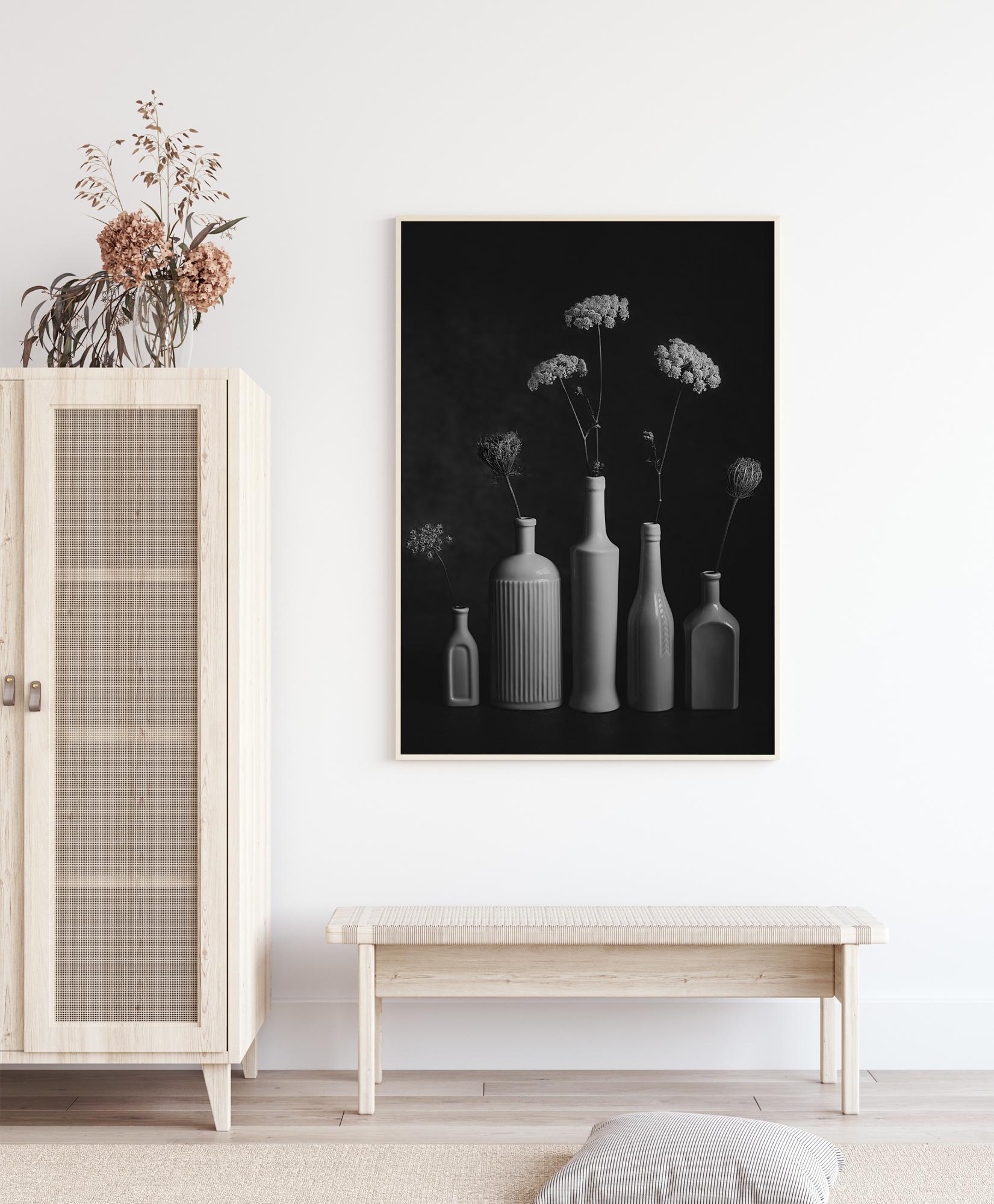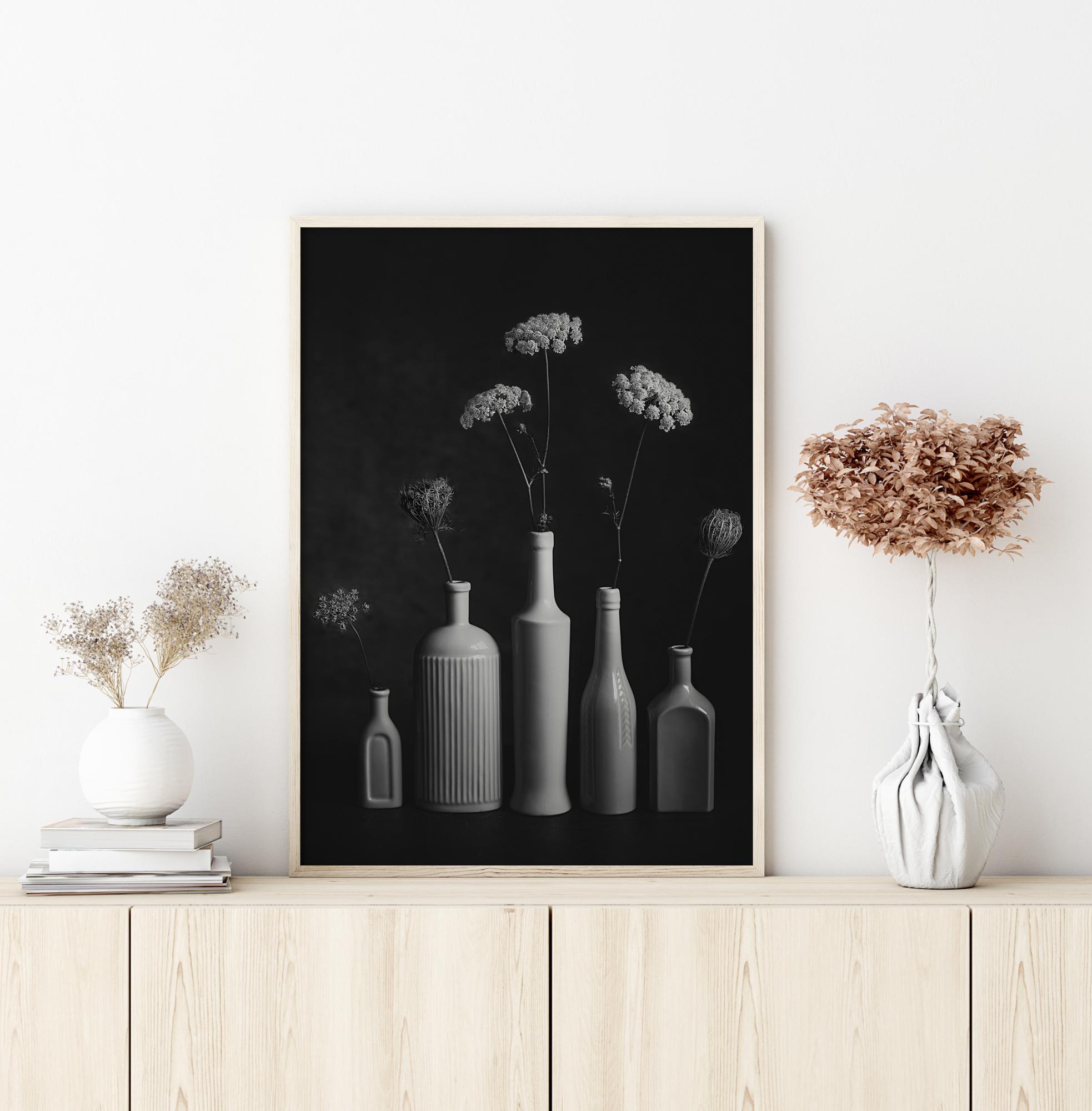 Tradicionalni plakat s steklenicami in cvetjem na preprostem črnem ozadju. Dodajte pridih nizozemskega slikarskega sloga v svoj dom s pomočjo tega preprostega, a še vedno močnega kompleta s steklenicami in cvetjem.