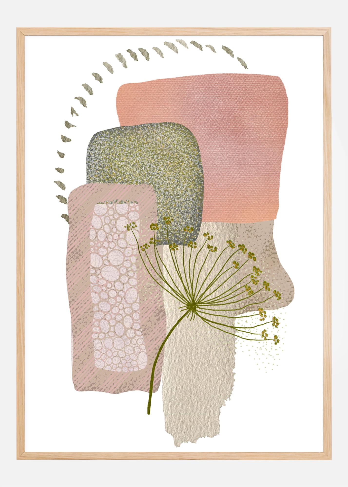 Ta poster ustvarja občutek miru in lepote skozi sproščeno kombinacijo mehkih tonov in abstraktnih oblik. Osrednji del kompozicije je nežno cvetno steblo, ki se razteza navzgor, s svojimi majhnimi zelenimi popki, ki jih osvetljuje tanko, elegantno steblo. Plasti teksture in barve ustvarjajo globino in zanimanje, ki privablja pogled in vabi k daljšemu opazovanju. S svojo pomirjujočo roza in zeleno paleto ta umetniški tisk prenaša občutek naravne tišine in preprostosti, zaradi česar je čudovit dodatek vsakemu domu.