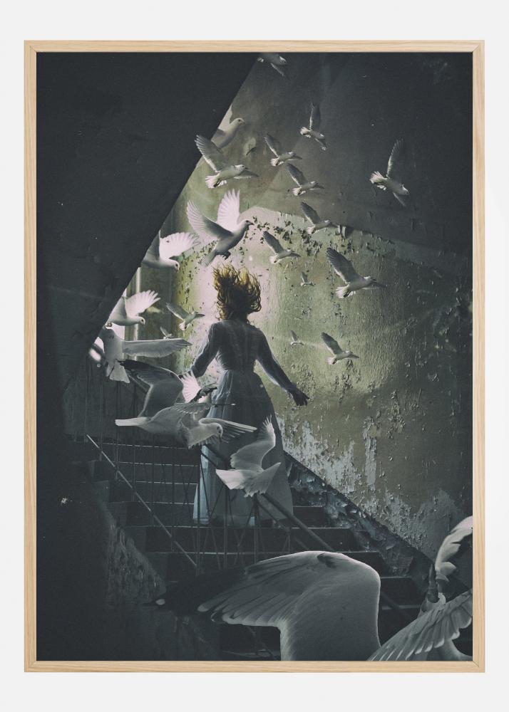 Prijeten plakat z deklico, ki se vzpenja po stopnicah in okoli njene glave leti jata belih ptic. Sivozelene stene so višje gor svetlejše. Bele golobe letijo in vrtinčijo dekličine lase. Spremljajte to devico, medtem ko se med pticami vzpenja proti svetlobi.