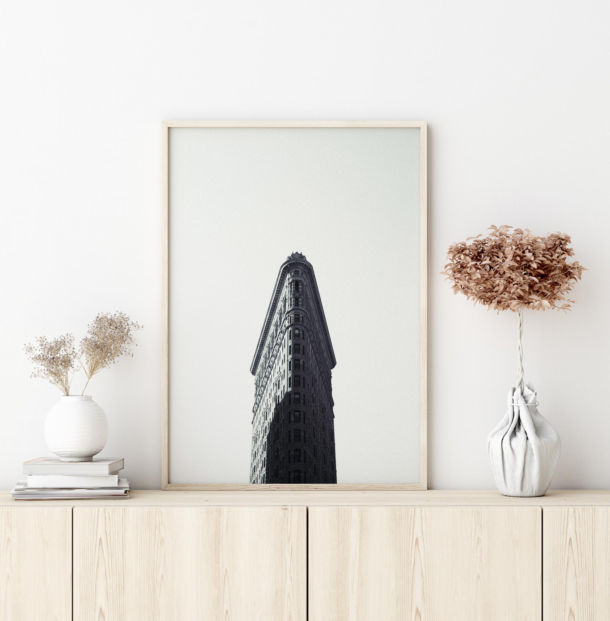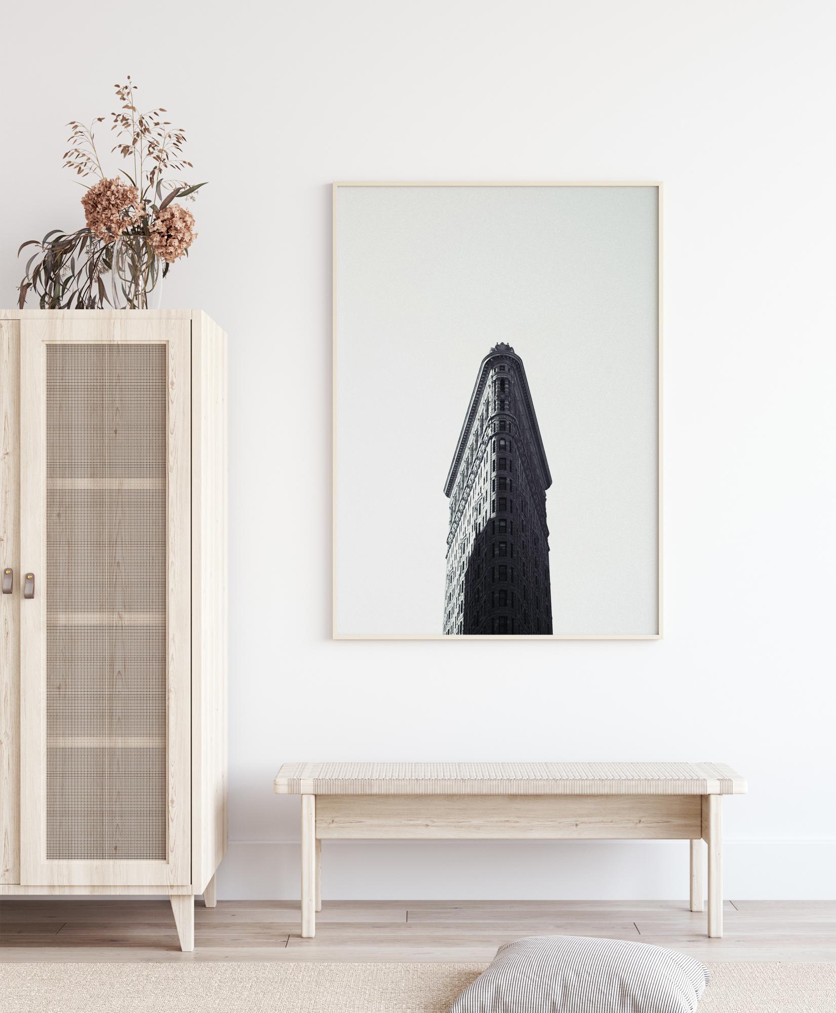 Arhitekturni plakat, ki prikazuje sprednji kotiček starega stanovanjskega bloka. Sprednji del stavbe je videti kot lok ladje, ki močno kontrastira z belim nebom. Trikotna oblika pritegne poglede in jih vodi navzgor po stavbi. Obesite to delo na enobarvno steno, da ustvarite umetniško vzdušje.