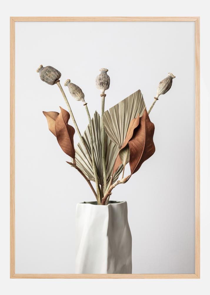 Ta prefinjeni poster prikazuje elegantno kompozicijo posušenih rastlin in semenskih kapsul, ki se dvigajo iz elegantne bele vaze. Aranžma je poklon stacionarni lepoti sveta rastlin z različnimi odtenki od sive in rjave do globoko rdeče-rjave in zelenkastih tonov. Ta tisk zajema trenutek miru, kjer je edinstvena oblika in tekstura vsake rastline za vedno ohranjena v obliki umetnosti.