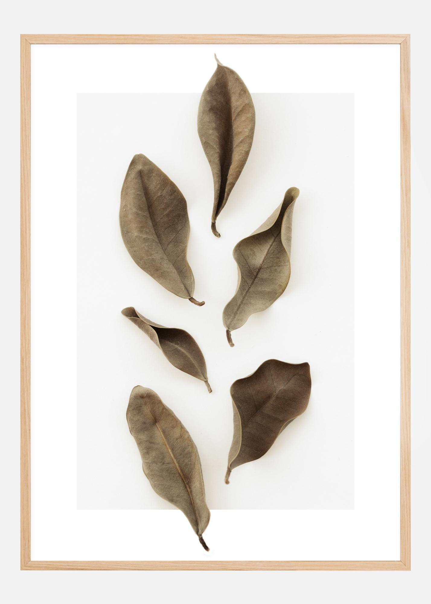 Podroben poster s posušenimi listi. Šest posušenih listov je razporejenih, kot da so še vedno na veji, na beli podlagi. Rjavi listi so preprosti in običajni, popolni za izboljšanje živahne stene ali dodajanje vzorcev preprosti.