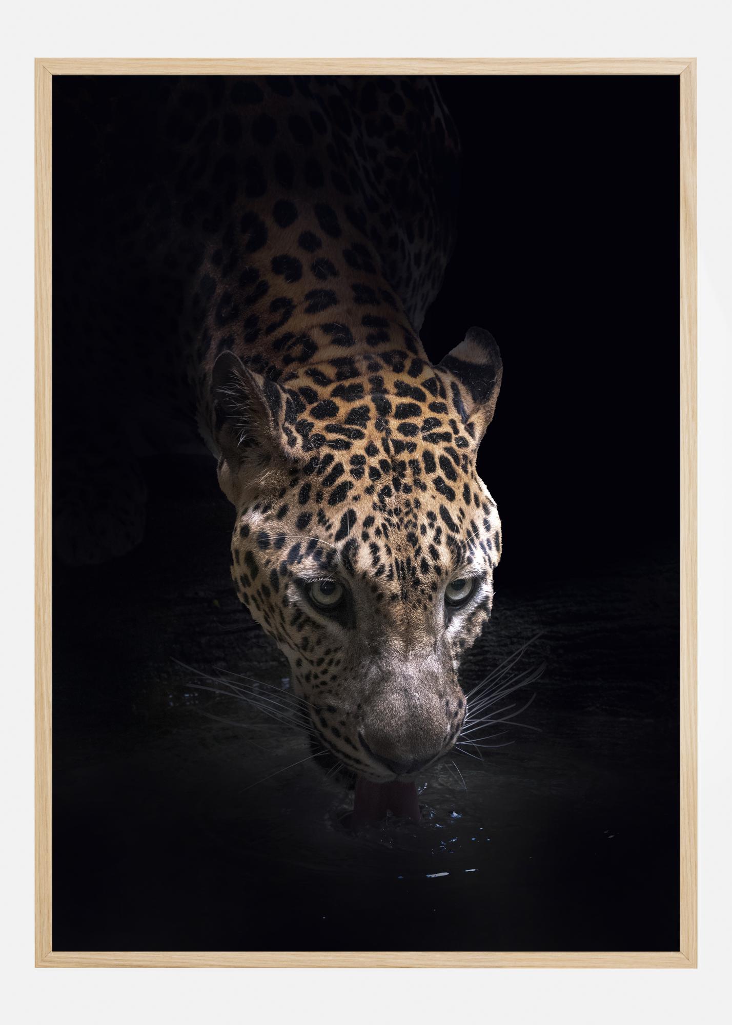 Ta dramatičen plakat prikazuje leoparda v intimnem trenutku, ko mirno pije vodo, močan trenutek divje narave, ujet v času. Črno ozadje poudarja zlato barvo veličastnega kožuha in izrazite lise, kar ustvarja skoraj tridimenzionalni učinek. Leopard je obrnjen proti opazovalcu z izrazom, polnim koncentracije in prisotnosti divje živali, kar ustvarja takojšnjo povezavo med živaljo in človekom.