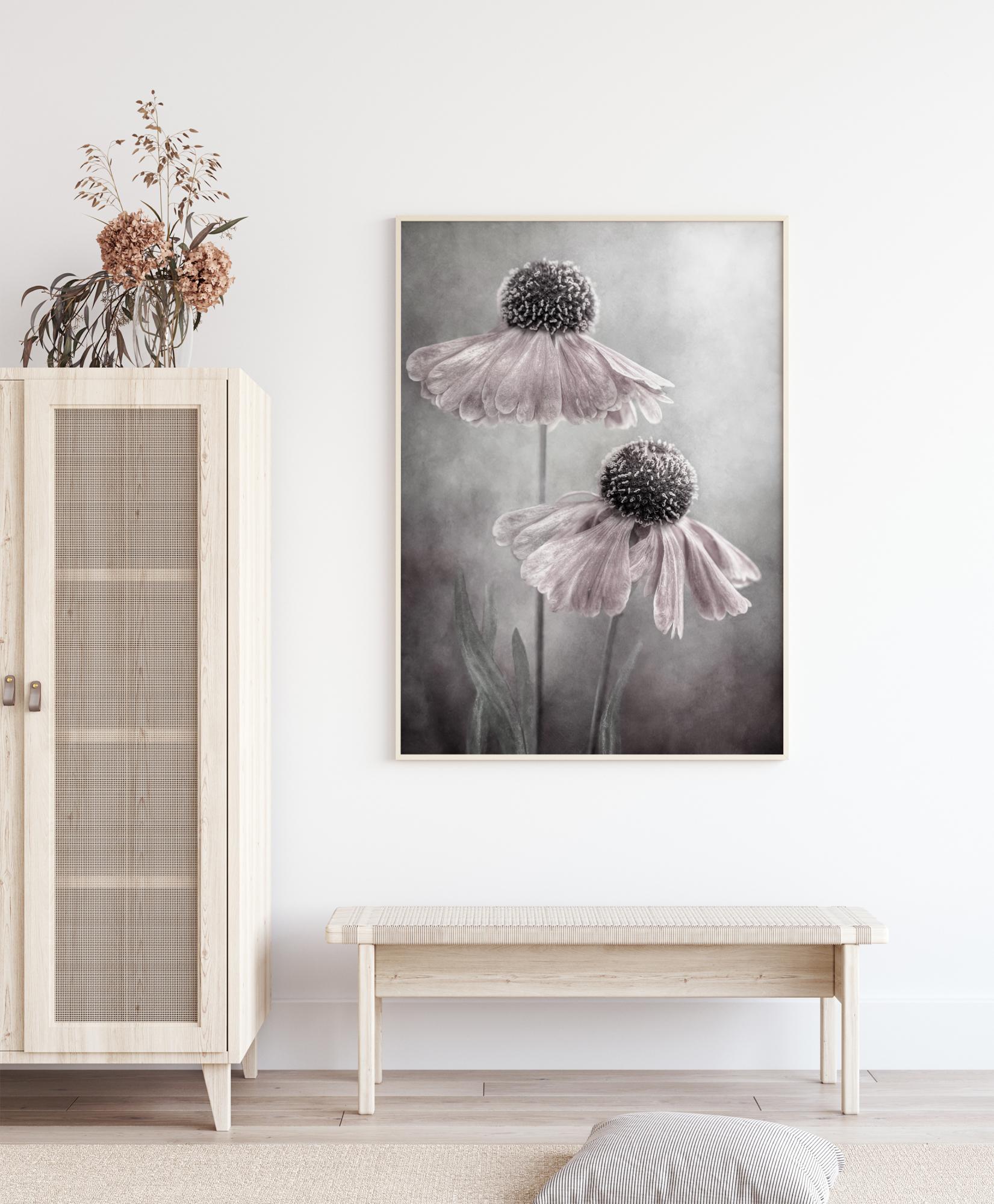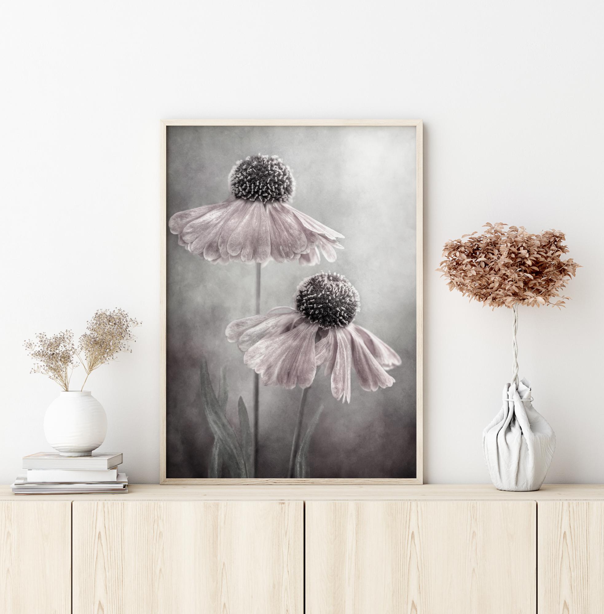 Lepa plakat z dvema marjeticama, ki se raztezata proti nebu. Beli venčni listi na glavicah marjetic visijo navzdol z okroglega sredine cveta. Ozadje je megleno sive barve, kjer svetloba pronica za atmosfero. Začutite magijo tega prefinjenega plakata, ko ga obesite v spalnici.