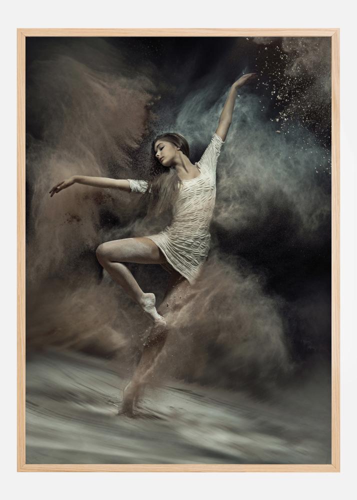 Dinamičen plakat s čudovito balerino, ujeta sredi koraka. Atletsko dekle je oblečeno v belo in se graciozno zavija, da ustvari gibanje na sliki. V ozadju so mehki oblaki v sepiji in pastelnih barvah, ki ustvarjajo nežen vtis. Izgubi se v čarovniji te elegantne slike.