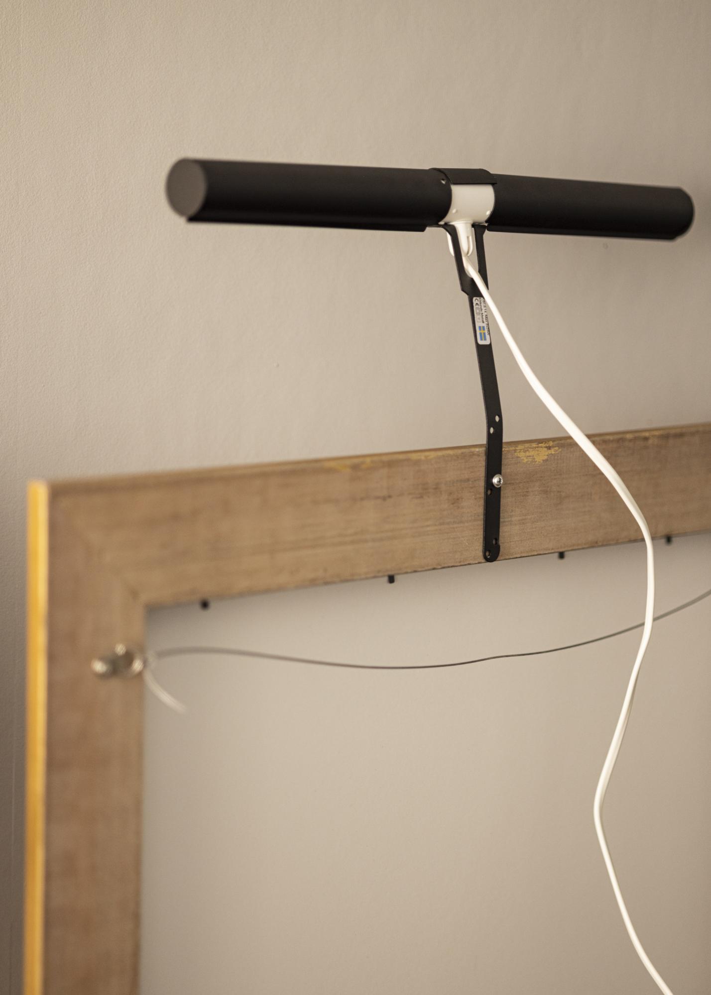 Osvetlitev slike običajno pritrdite na zadnjo stran okvirja, kar zahteva leseni okvir (nekateri kompozitni okvirji prav tako delujejo), ki ima širok profil, da je mogoče priviti v okvir. Z našim stenskim nosilcem tega ne rabite storiti, saj preprosto namestite osvetlitev slike neposredno na steno za sliko.
