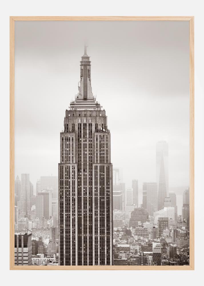 Mestna plakat z Empire State Building v New Yorku. Empire State Building je tukaj v ospredju, kjer stoji z New Yorkom v ozadju. Ostali del mesta je delno skrit v megli, kar omogoča, da podrobnosti tega nebotičnika jasno izstopajo. Predstavljajte si, da je to vaš pogled, ko ga obesite v svojem domu.