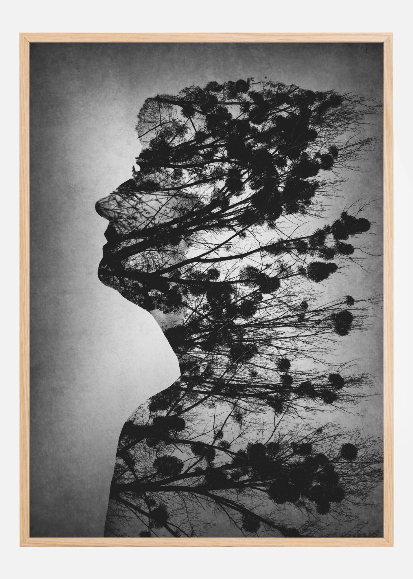 Abstrakten poster z ženskim obrazom, ustvarjena z uporabo različnih listov in vej. V čudoviti črno-beli barvi ustvarja ta dramatična poza občutek, kot da je veter zanesel te liste čez njen obraz. Močna osvetlitev v ozadju poudari profil, kar daje temu močan, a prozoren občutek.