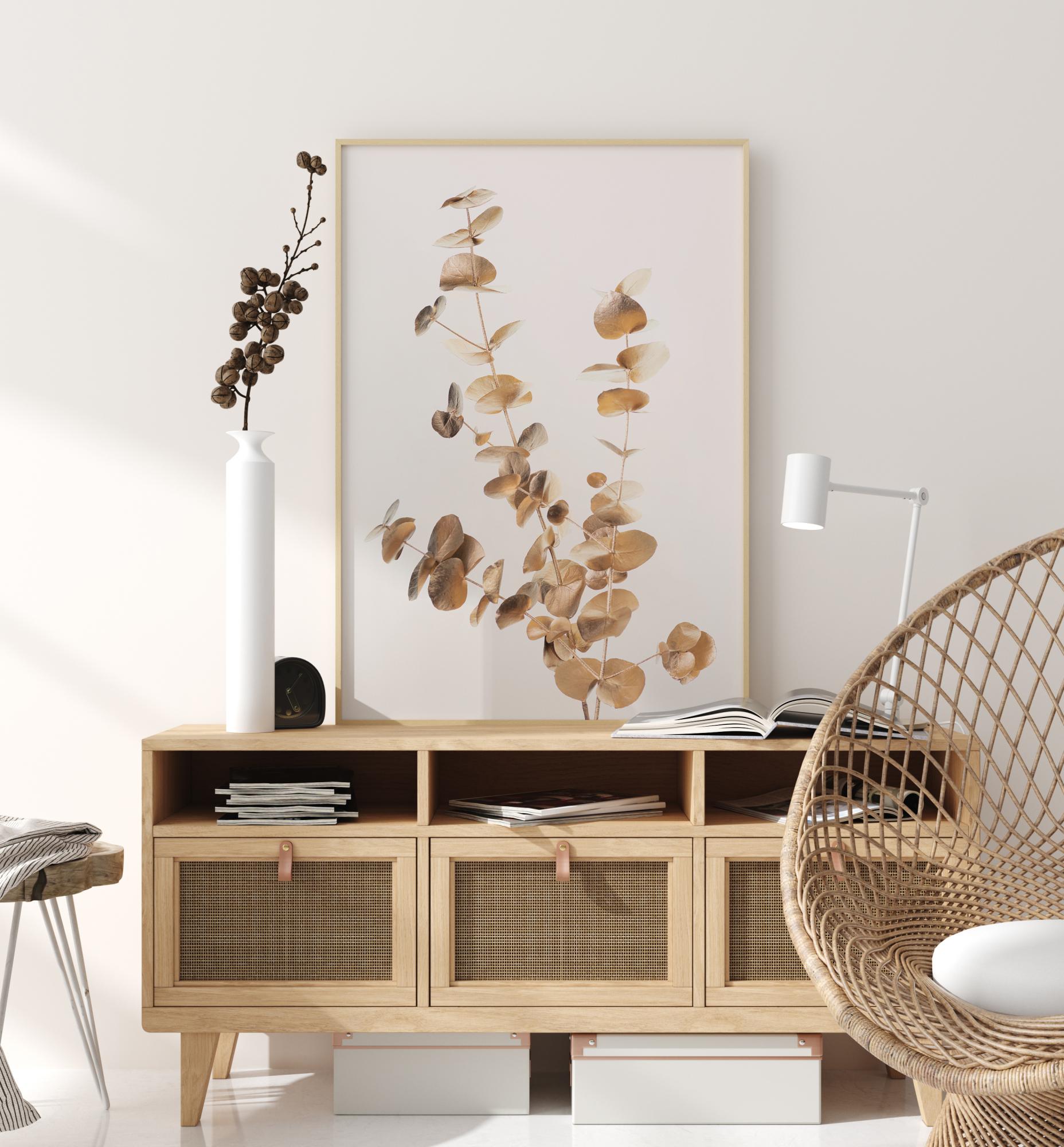 Preprost plakat z več zlatimi vejami evkaliptusovih listov. Barve v zlati in rjavi so pomirjujoče in sproščujoče. Veje so na beli podlagi tako, da se močno zlato izstopa za dramatičen, a eleganten učinek v vašem domu.