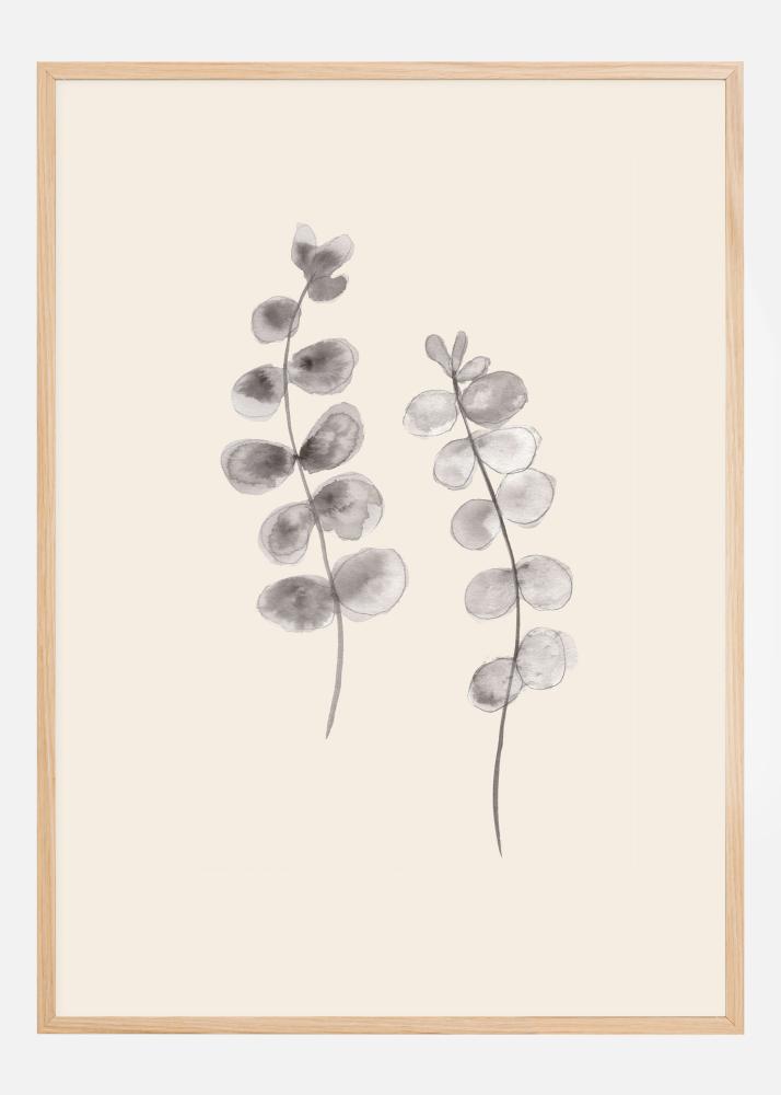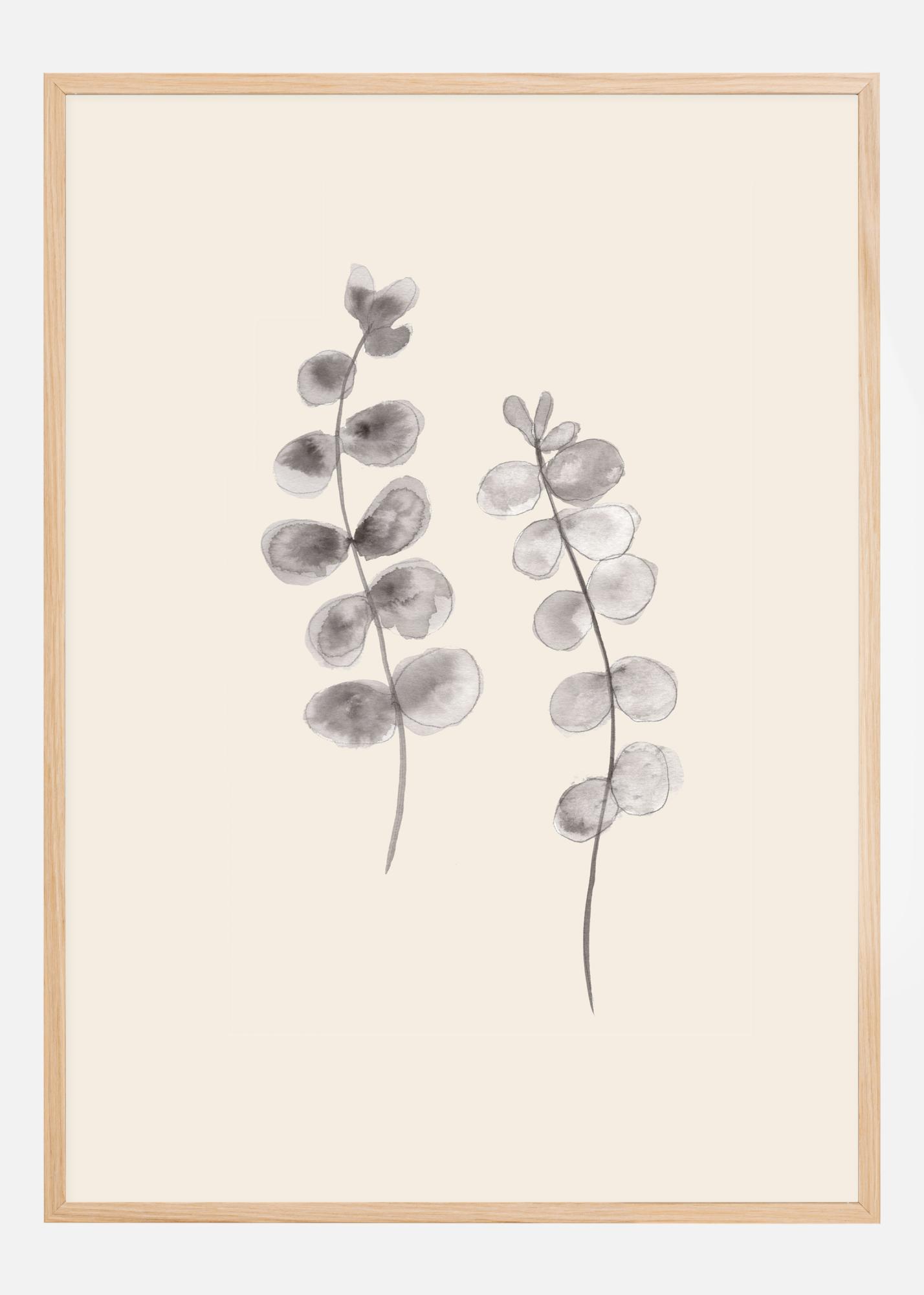 Botanični plakat z dvema sivima vejicama z evkaliptusovimi listi. Na sredini bele podlage sta dve sivo pobarvani veji z evkaliptusovimi listi. Skupaj se upogneta, da ustvarita mehko krivuljo, ki usmerja pogled navzgor skozi plakat. Obešanje tega zelenega plesa v vašem domu zagotavlja pomirjujoč občutek.