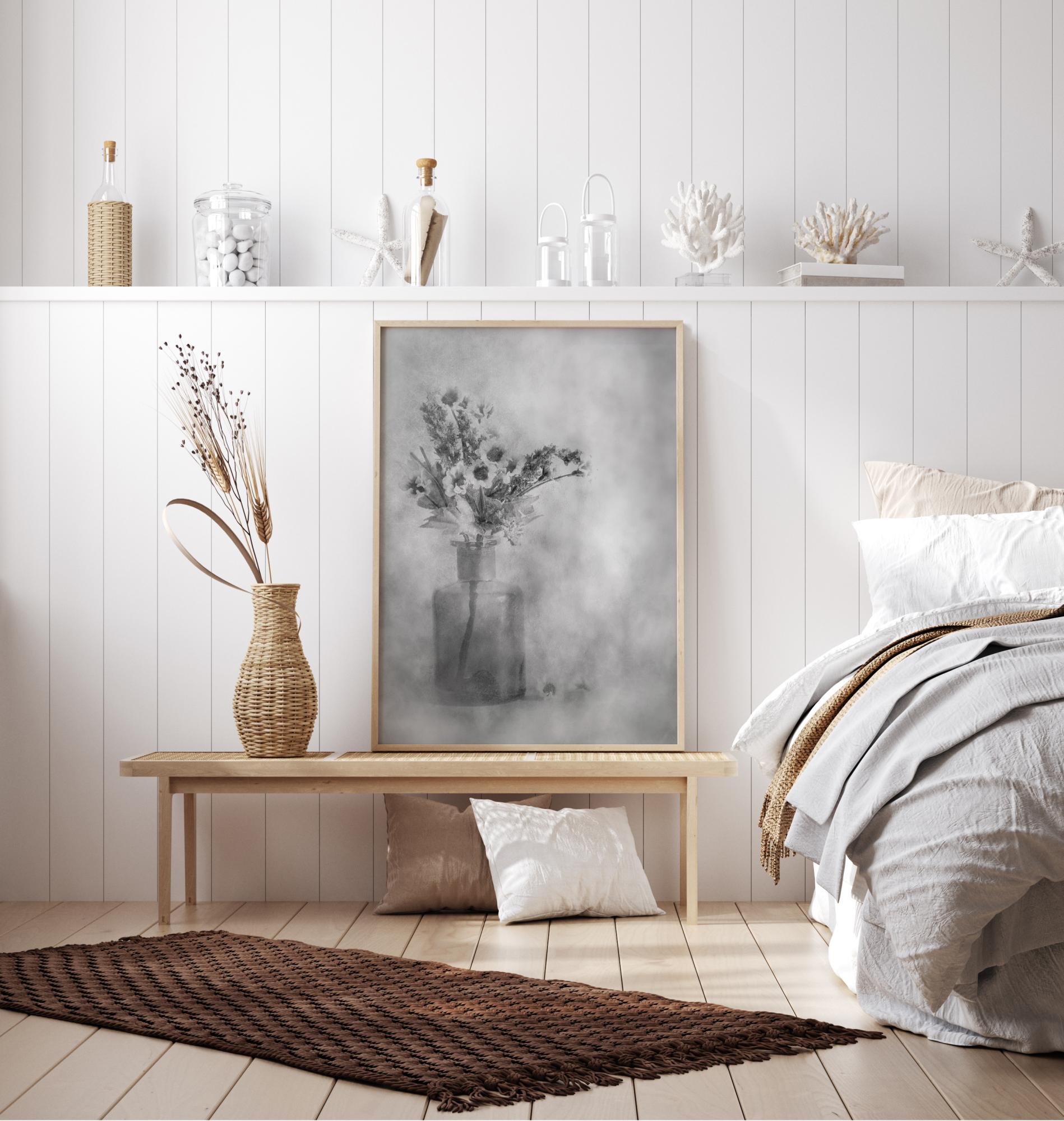 Romantičen poster z mehkim tihožitjem z vazo in cvetjem. Ta sivkasta slika ima mehko naslikan občutek in minimalen kontrast med različnimi deli slike. Predstavljajte si, da se pripravljate na slikanje tega mirnega prizora, ko ga obesite na pastelno steno doma.