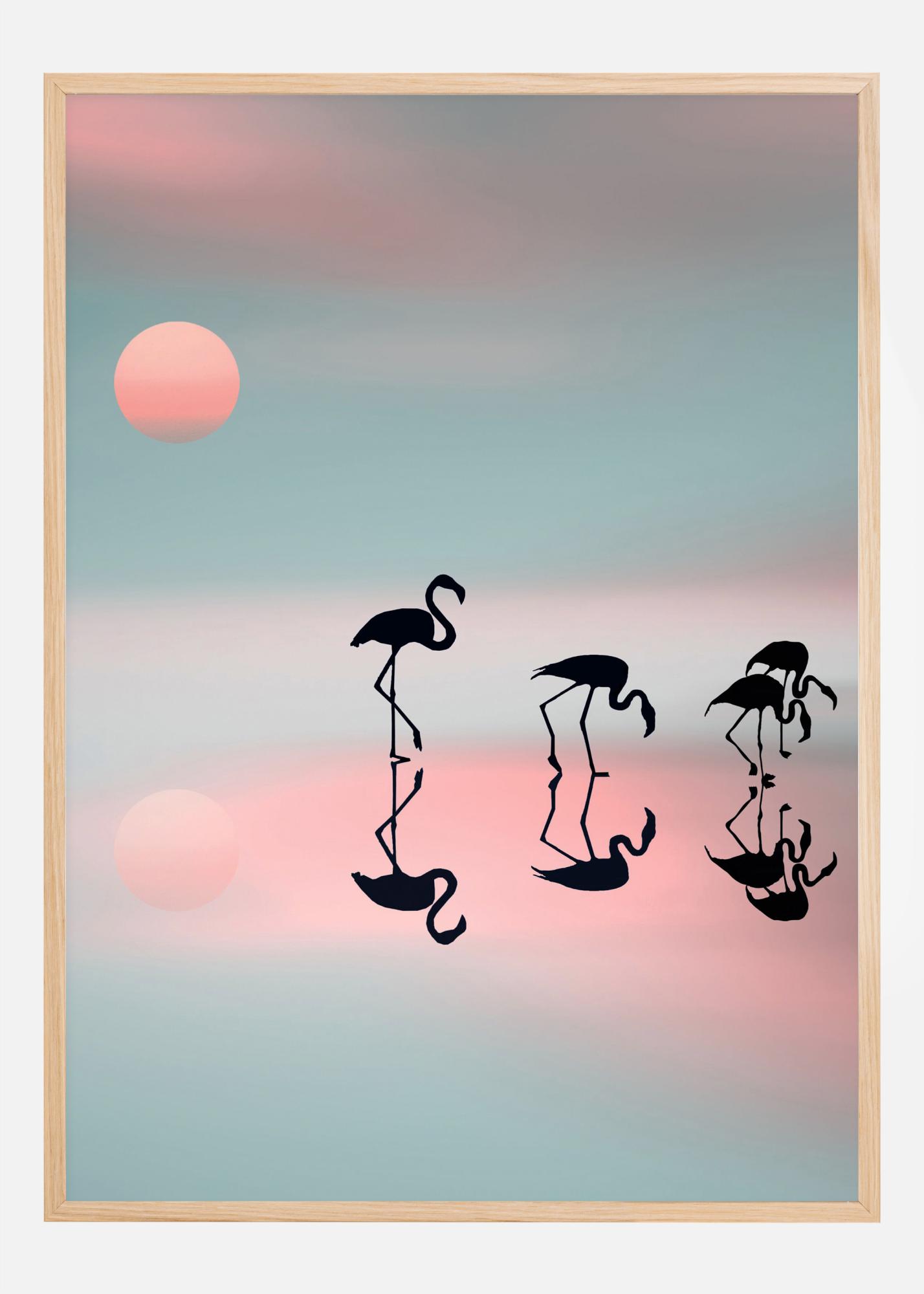 Živahen poster s štirimi flamingi, ki se hranijo ob svetlo pastelno obarvanem jezeru. Modra, roza in breskova svetloba ustvarjajo mehko sliko s silhueto družine flamingov, ki previdno hodi po jezeru. Skoraj lahko začutite mir v tej nežni, subtilni podobi.