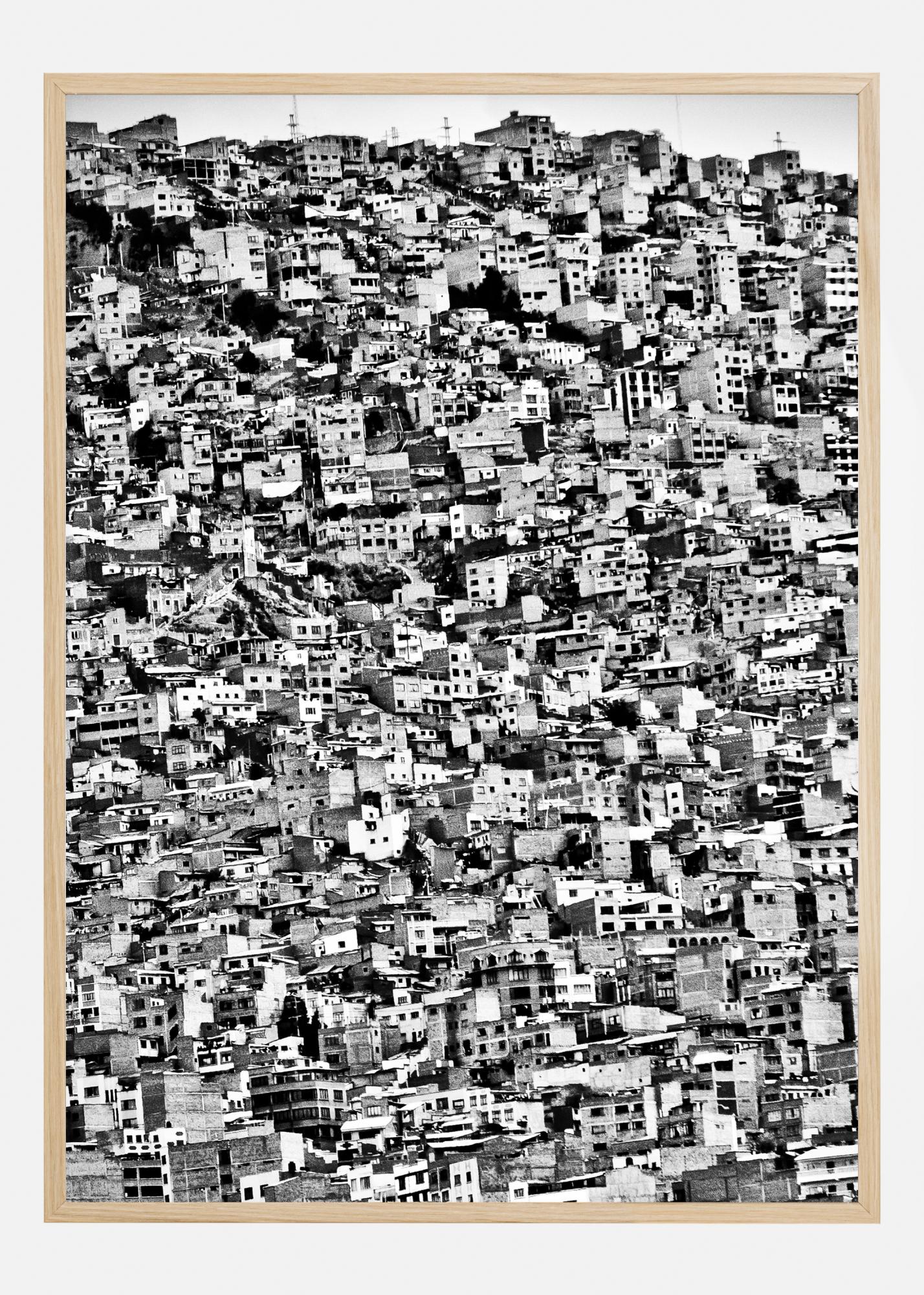 Poster mestne krajine s stotinami hišic v El Alto La Paz Favela v Boliviji. Slika je polna belih fasad hiš in njihovih odprtih črnih oken, kar ustvarja nemirno, a fascinantno podobo. Izgubite se v labirintu hiš, ko to obesite v svojem domu.