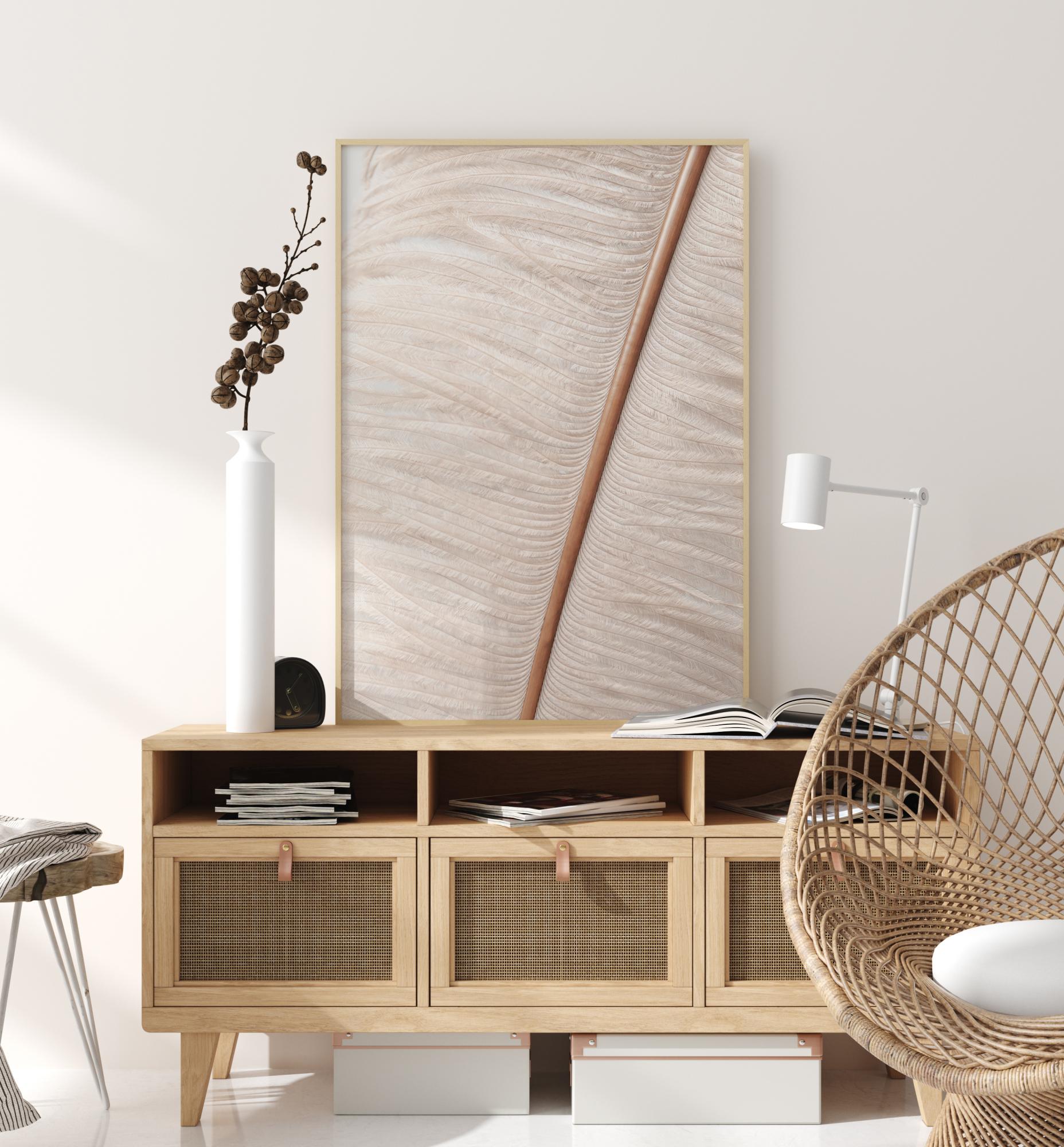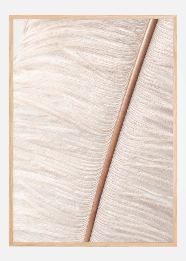 Makro plakat z osjo strusovega peresa. Ta povečana slika prikazuje močno osrednjo os z vsemi majhnimi puhastimi belimi vilicami, ki se razvejajo. Podrobnosti so osupljive na tem mehkem, a vseeno impresivnem plakatu. Združite s nevtralno steno za mehak učinek.