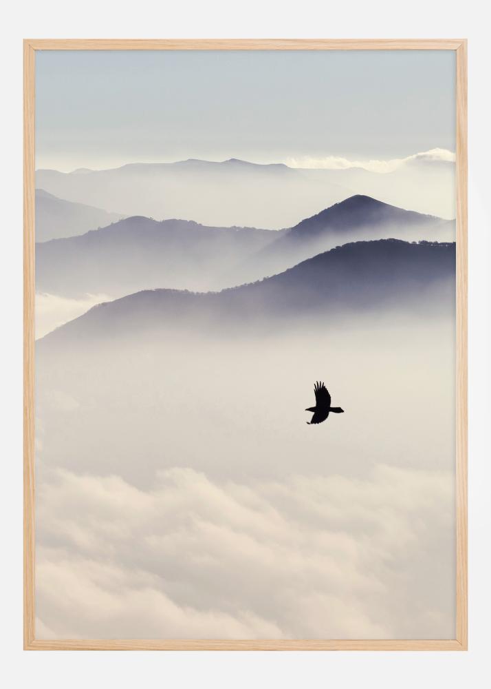 Ta naravno navdihnjen plakat zajema preprosto, a vendar močno podobo svobode in tišine. Osamljena ptica veličastno jadra nad meglenim dolinskim območjem, s plastmi gora, ki postopoma izginjajo v mehki svetlobi zore ali mraka. Mehki toni in minimalistična pokrajina dajejo občutek miru in neomejene svobode.