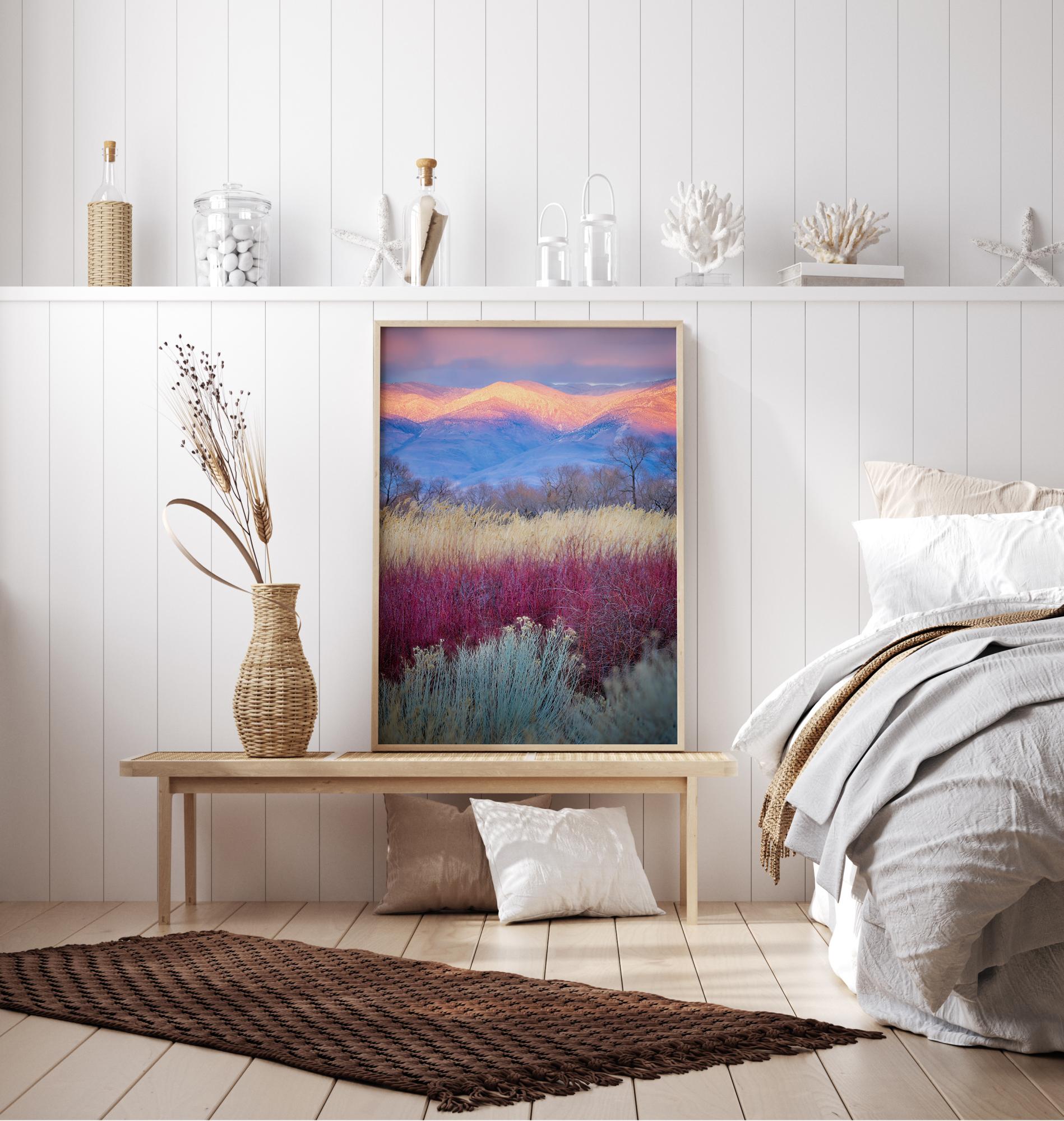 Barvita plakat polj, ki se raztezajo proti oddaljenim goram. Svetle barve vodijo pogled od zelene, roza, rumene, modre do oranžne. Sonce le pokuka nad gorami v daljavi. Občutite zgodnje jutranje svetlobe in nov dan v tem delu.