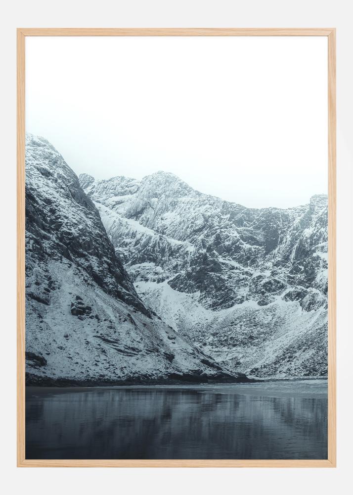 Dramatičen poster s snežno prekritimi gorami, ki vodijo navzdol proti mirni vodi. Jezero ali morda fjord se razteza proti zasneženim goram in se srečuje z njimi v ospredju. Svetla bela nebo pomaga ustvariti občutek zime. Prinesite hladno vreme v notranjost, ko obesite to sliko.