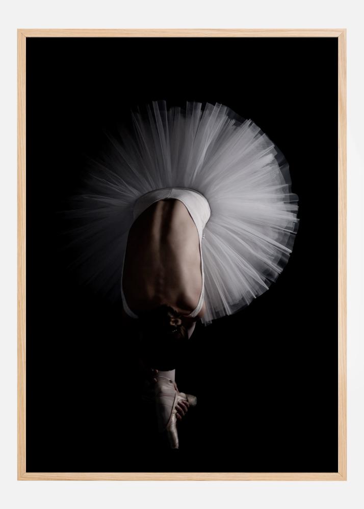 Dramatičen poster z zračnim posnetkom baletne plesalke, ki se nagne naprej, da doseže svoje čevlje. Črno ozadje omogoča, da bela baletna krila izstopajo v svetlem krogu okoli nje. Močne linije na hrbtu usmerjajo pogled na elegantno iztegnjene noge. Eleganca in drama se zlijeta v tej edinstveni podobi.
