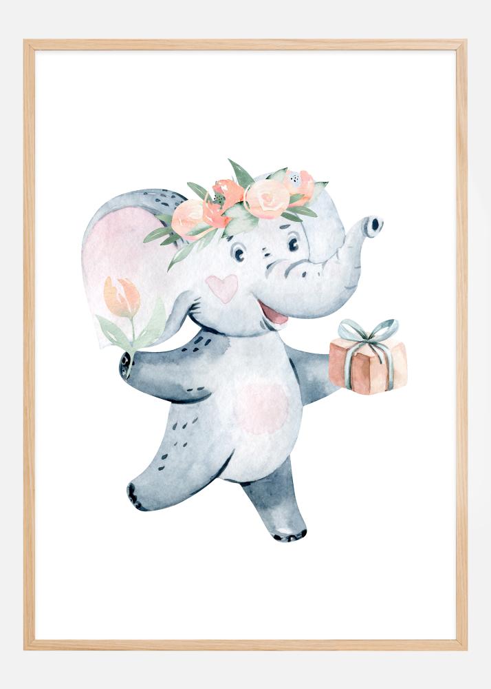 Popestrite vzdušje v katerem koli prostoru s to očarljivo sliko slončka, ki izraža veselje in nedolžnost. Prikazuje šarmantnega sivega slončka, ki lahkotno stopa, s cvetnim venčkom v roza in breskovih odtenkih na glavi. Njegov izraz je poln prijaznosti in sreče, v ta pa drži skrbno zavito darilo, kar prizoru dodaja dodaten pridih veselja in velikodušnosti.