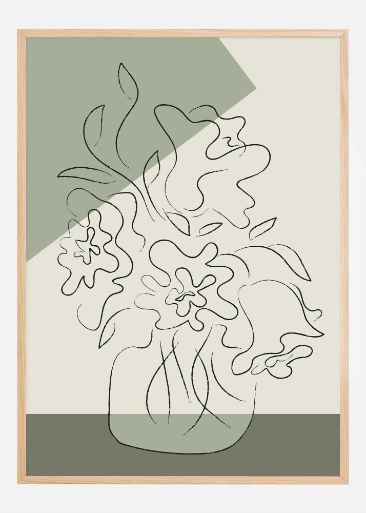 Ta umetniški abstraktni poster prikazuje stilizirane cvetne liste in listje v elegantni, tekoči risbi, ki lebdi nad dvobarvnim ozadjem mehkih zelenih in nevtralnih tonov. Preprosta lepota dizajna, okrepljena s subtilno teksturo, ki daje organski občutek, ustvarja sproščeno in mirno atmosfero. Ta moderna in elegantna tiskovina bi se popolnoma zlila z minimalističnim ali skandinavsko navdihnjenim domom, ter prinaša dotik naravnega miru, ne da bi preobremenila prostor s preveč barvami ali kompleksnostjo.