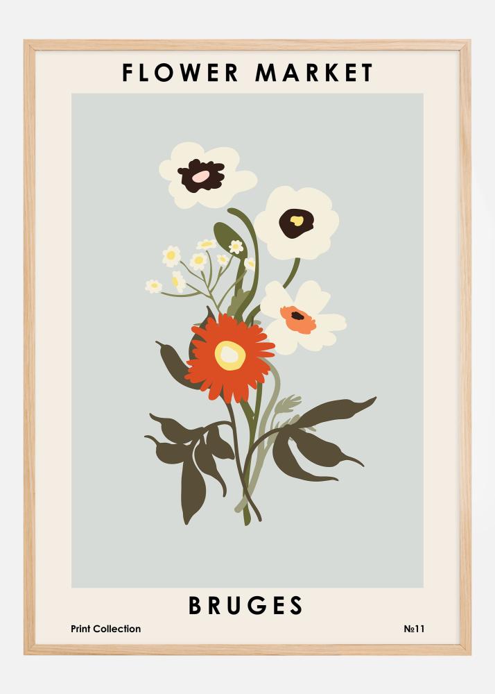 Ta očarljiv plakat iz naše kolekcije 'Flower Market' prikazuje edinstven izbor cvetlic, ki ujamejo bistvo slikovite in zgodovinske atmosfere Brug na. Z očarljivo zbirko cvetov v odtenkih sončno rumene, temno oranžne in mehko bele barve, ki izstopajo na utišani sivo-modri podlagi, ta print ponuja estetsko veselje, ki spominja na mirne in barvite cvetlične tržnice v Belgiji.