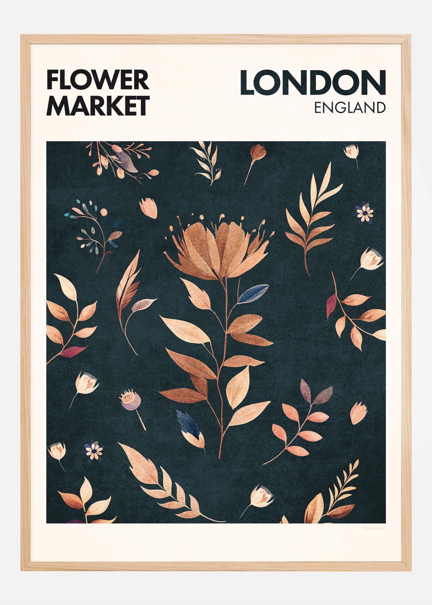 Ta očarljiv plakat prikazuje eleganco cvetlic s slavne londonske cvetlične tržnice. Barvita simfonija rastlinskega življenja, ki cveti v srcu Anglije, predstavljena z botanično ilustracijo, ki prikazuje zbirko cvetlic in listov. Oblikovanje izžareva občutek klasičnega britanskega šarma in brezčasne lepote narave.