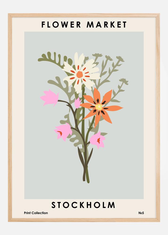 Ta plakat prinaša podobo stockholmske cvetlične tržnice z svežim in naravnim dizajnom, ki ujame utripajočo lepoto in zelenje mesta. Na tem tiskovini svetlobna igra med cvetovi in listjem ustvari življenje cvetočih motivov, ki so prikazani v odtenkih bele, roza in oranžne na nežno modrosivi podlagi. Gre za poklon skandinavski prestolnici ljubezni do narave in njene sposobnosti kombiniranja tradicije z modernim oblikovanjem.