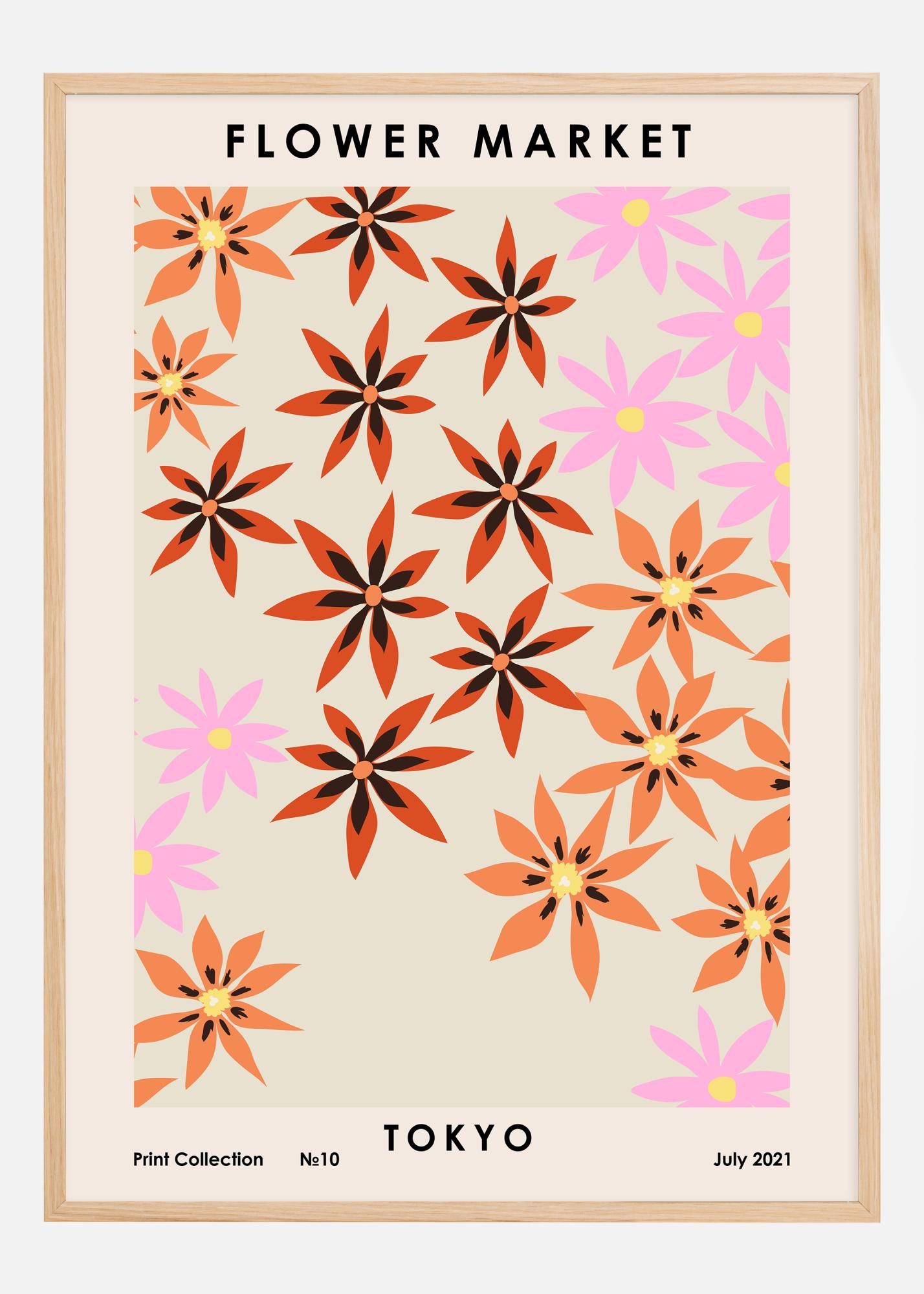 Ta živahen plakat zajame bistvo cvetličnega trga v Tokiu s svojim bujnim vzorcem cvetov v koralni, črni in roza barvi na svetlo bež ozadju. Ta poster daje igriv in sodoben občutek, ki obogati vsak prostor s svojo estetsko privlačnostjo. Vsak cvet je preprost, vendar umetniško upodobljen, z odtenki, ki dajejo občutek globine in dimenzije dizajnu.