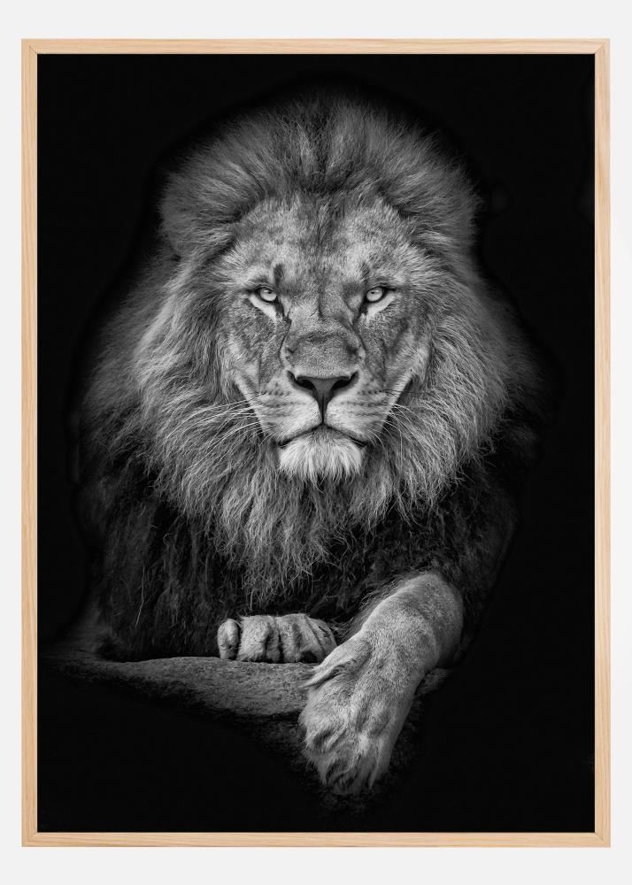 Črno-bela fotografija od blizu leva, ki gleda neposredno v opazovalca. Temno ozadje in intenziven pogled ustvarjata čudovito privlačnost slike. To je plakat, ki je videti enako dobro samostojno kot skupaj z drugimi priljubljenimi v večjem kolažu.