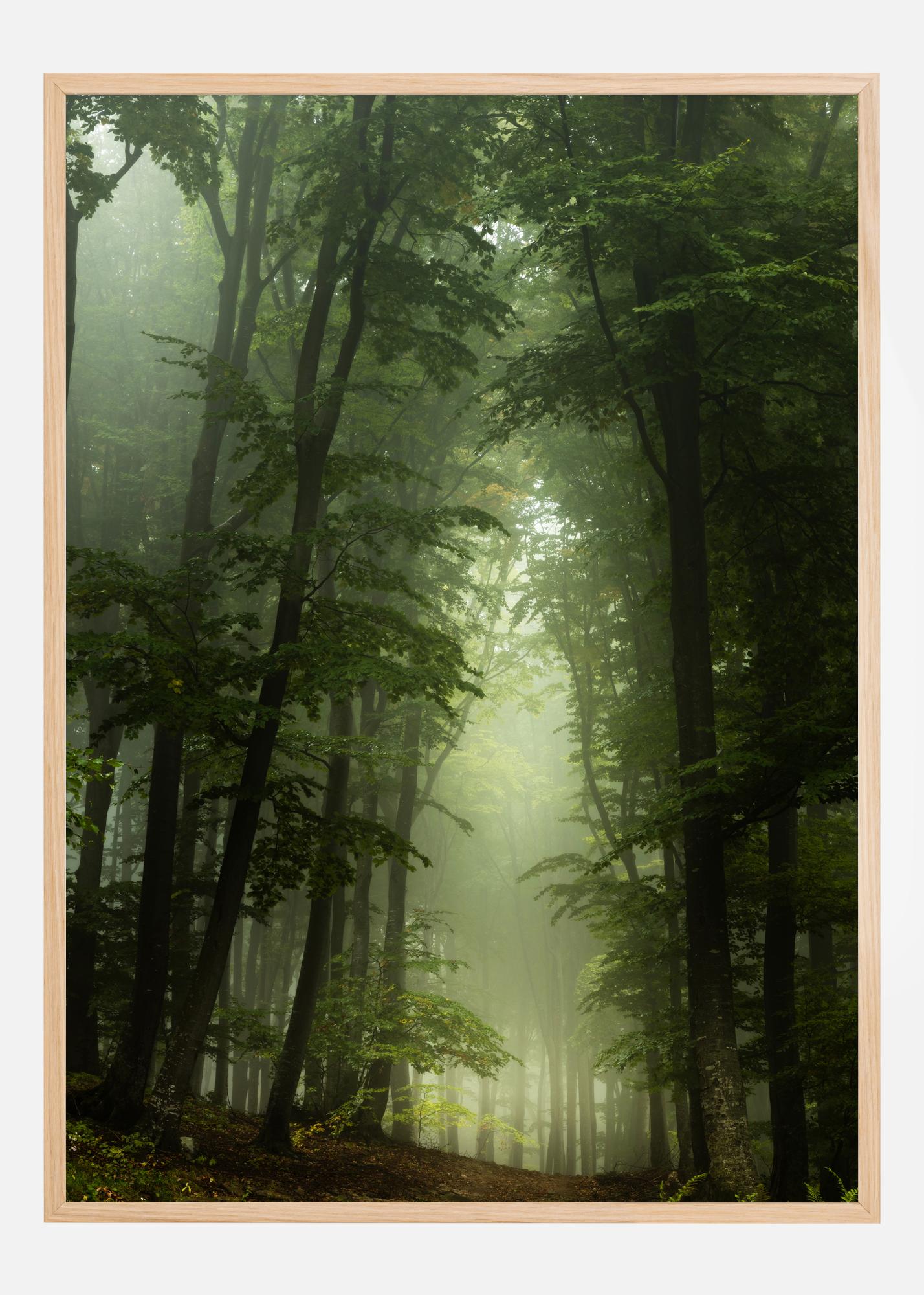 Ta atmosferski plakat te vabi, da se izgubiš v gozdu, zavitem v meglo, kjer se zdi, da vsako drevo pripoveduje svojo zgodbo. Mehka meglica, ki obdaja robusta debla dreves in živahno zeleno listje, ustvarja sanjsko sceno, ki se zdi, kot da prihaja iz drugega sveta. Nežno svetlobo, ki se filtrira skozi listje, prispeva k občutku mistike in miru.