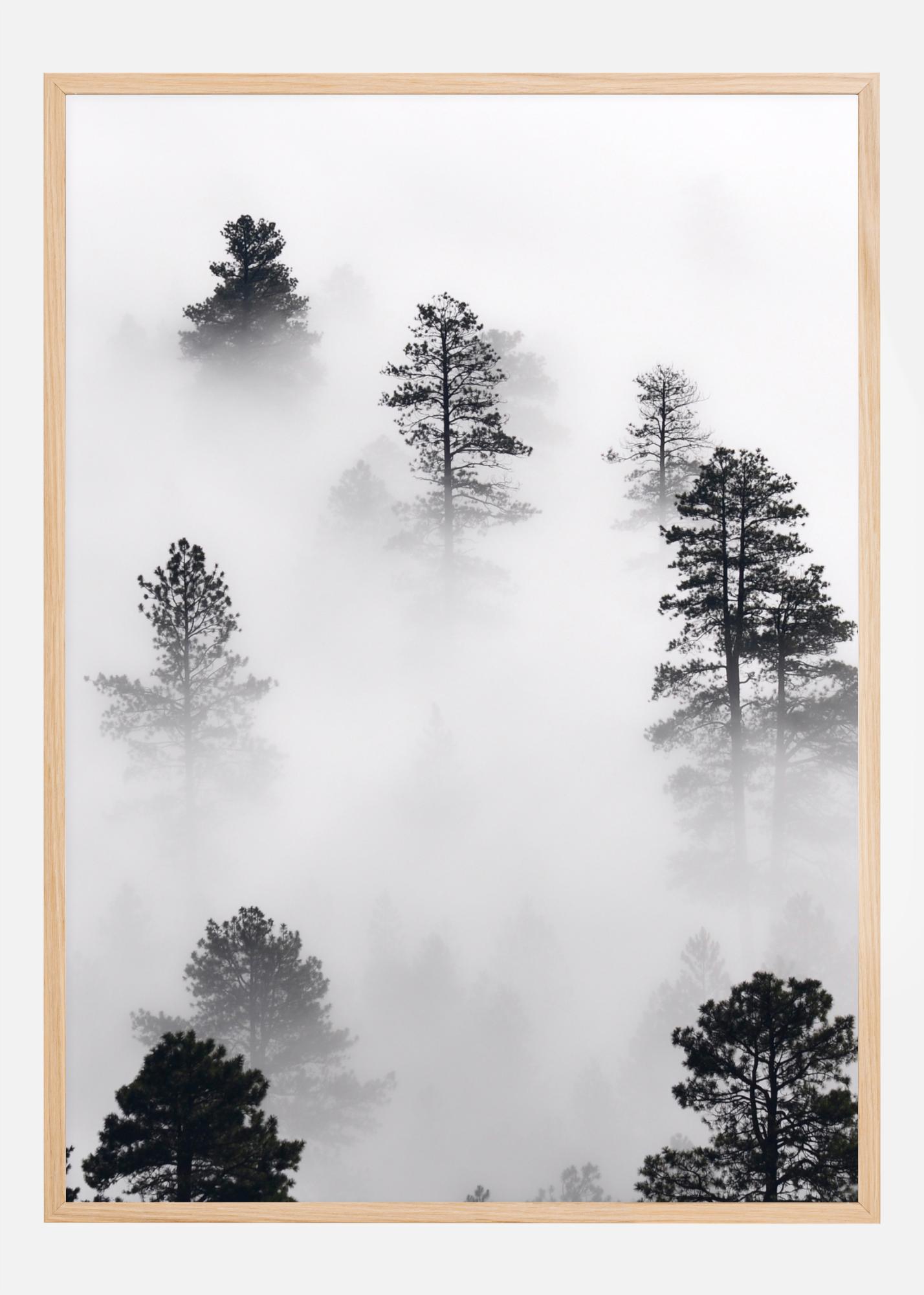 Izjemen plakat z motivom pokrajine z gozdom v megli. Visoki temni vrhovi dreves se prebijajo iz bledo bele meglice, kar ustvarja močan kontrast med meglo in drevesi. Vnesite hladno zimsko vzdušje v svoj dom, ko ga obesite na nevtralno steno.