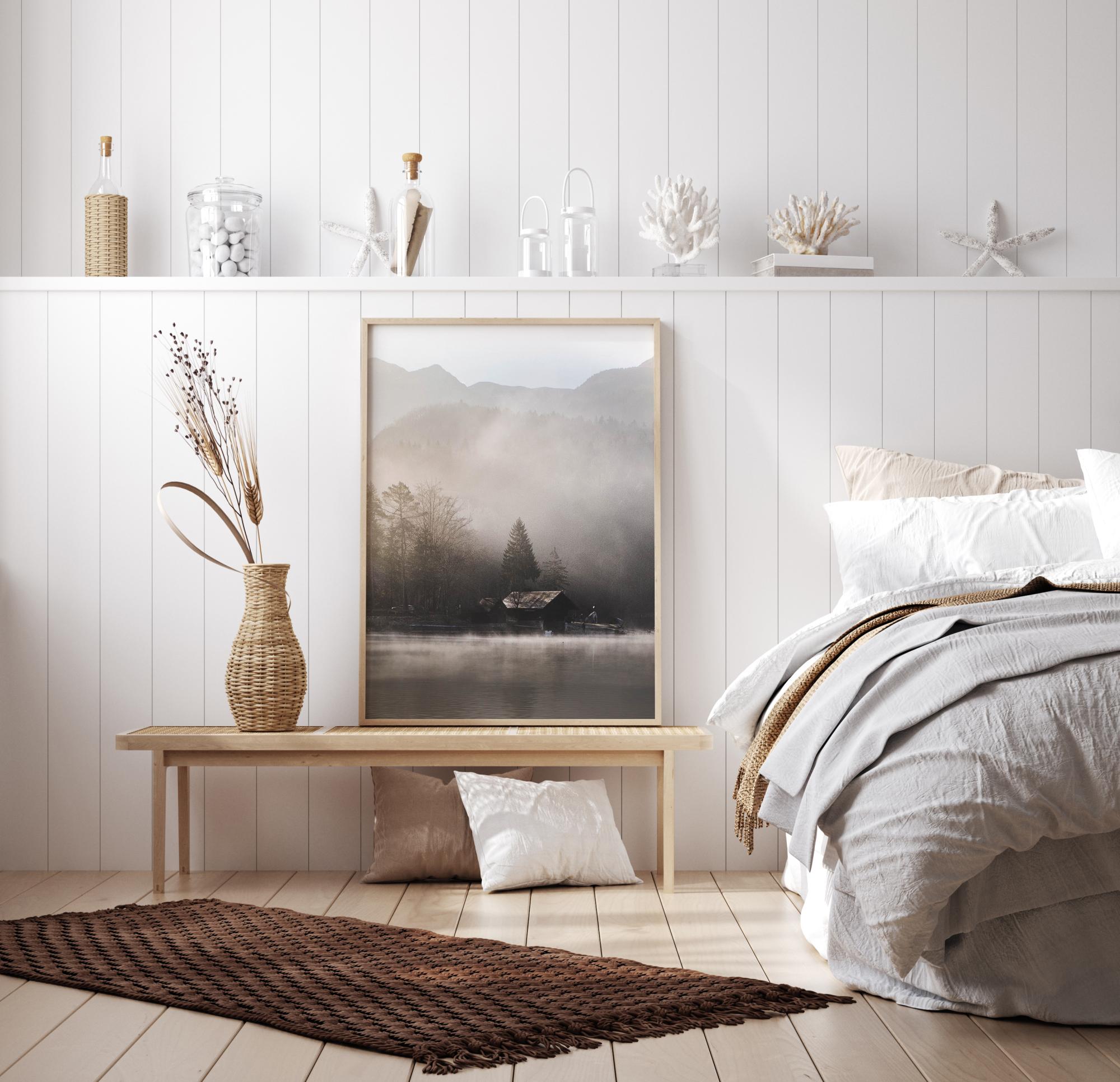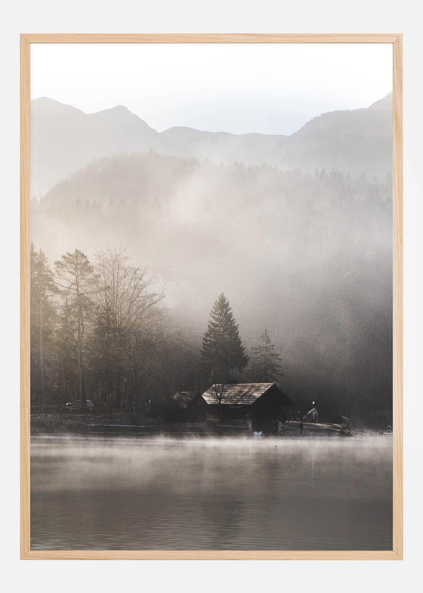 Prijetna plakat z kočo v gorah, ki leži na robu meglenega jezera. Mehke pastelne barve dajejo tej podobi blag občutek, kjer zgodnje jutranje sonce sije z desne strani, da dviguje meglo. Obešajte jo na preprosto steno in se izgubite v osamljeni divjini in preprostosti tega razpoloženjskega plakata.