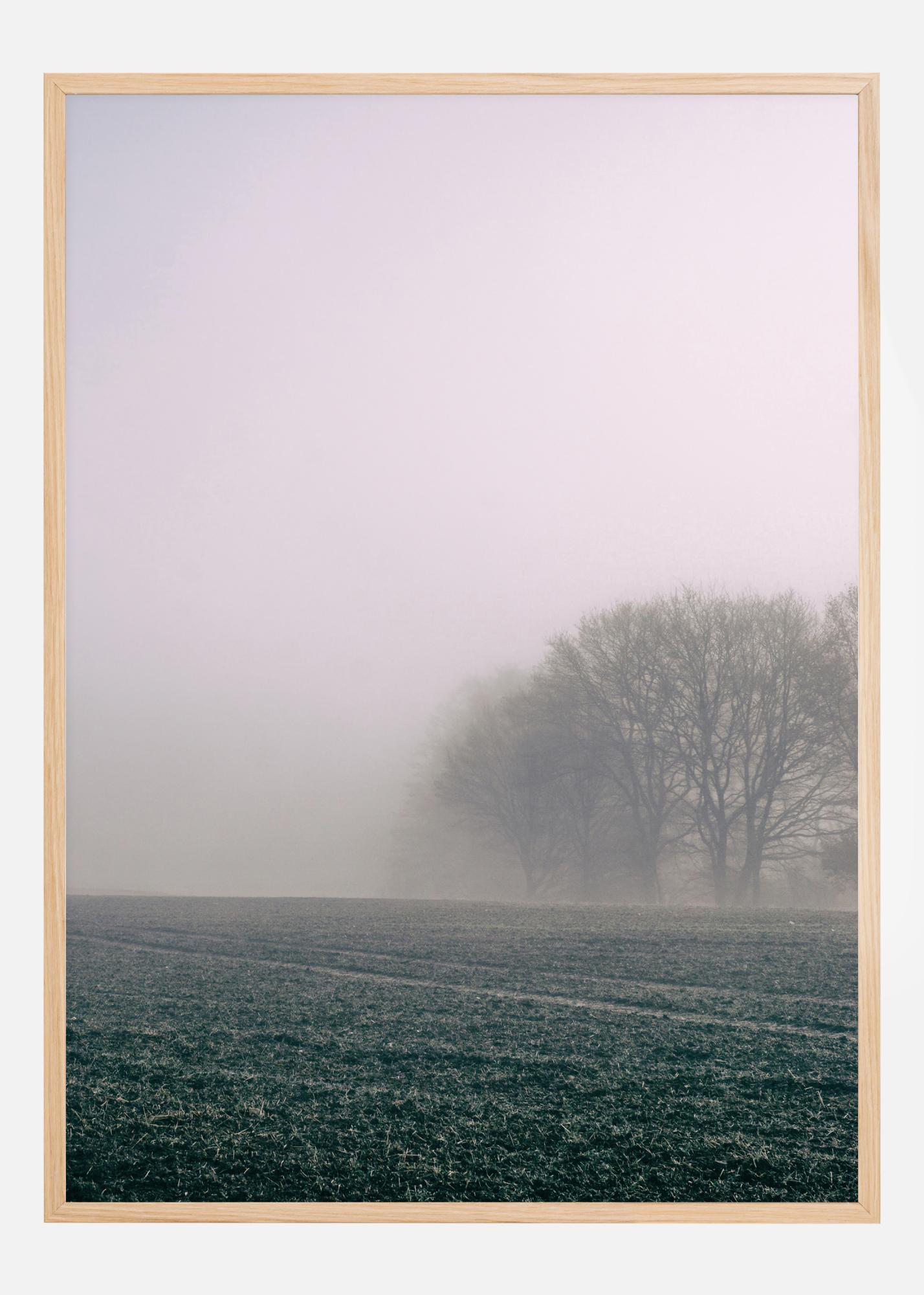 Svetla plakat s poljem in drevesi v zgodnji jutranji megli. Vzhajajoče sonce napolni fotografijo s svetlobo, osvetli zeleno polje in dvigne meglo. Drevesa v megli zapolnjujejo ozadje tega zelo britanskega jutranjega prizora.