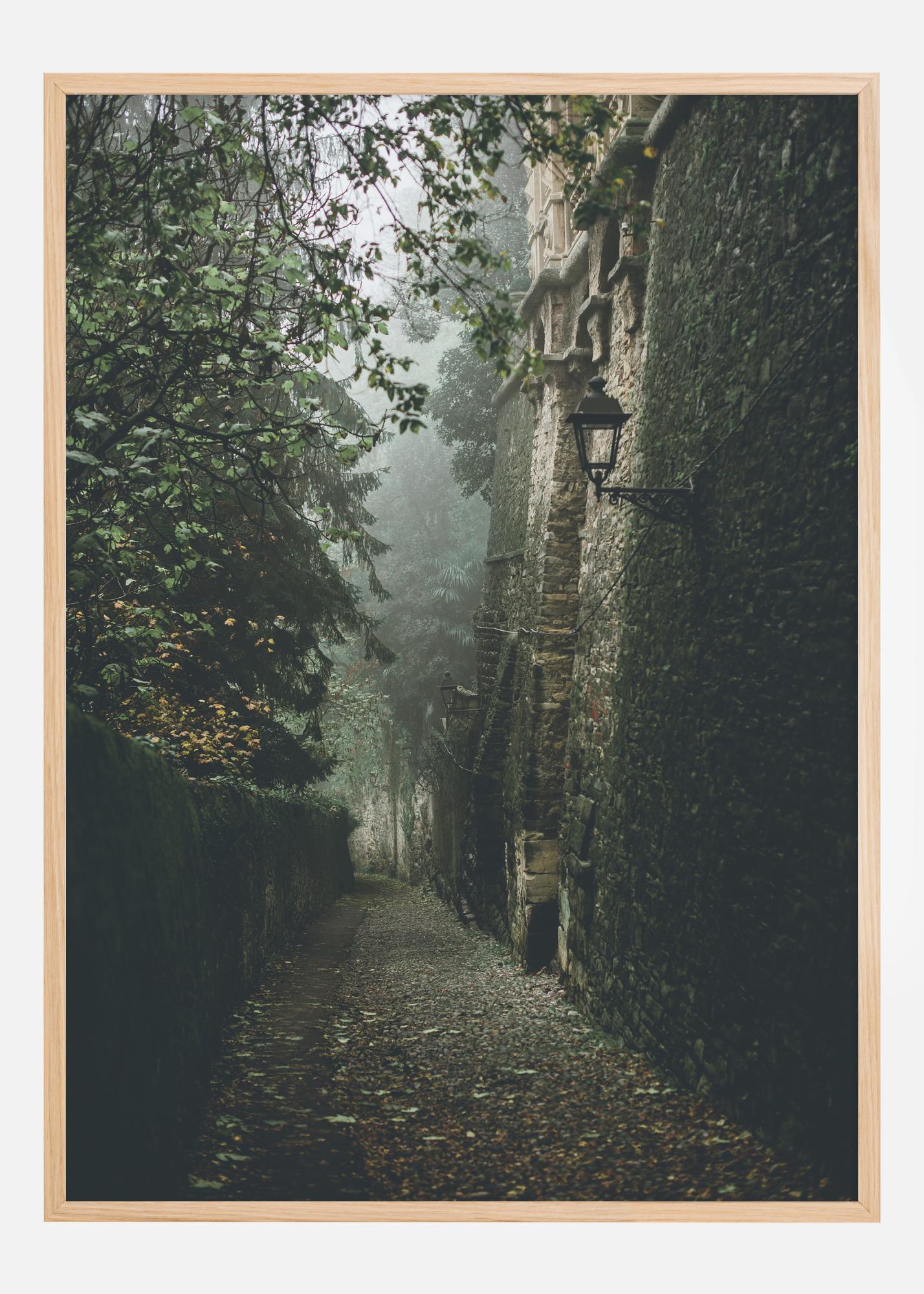 Ta očarljiv poster zajema skrivnostno in začarano ulico, ovito v meglo in obdano z zidovi zgodovine. Ulica, ki jo obdajajo z mahom pokrita stena in listje, ki tiho visi navzdol, daje občutek, da ste stopili naravnost v drug svet. Stara svetilka, pritrjena na stavbno kamnino, krepi zgodovinski in romantični občutek, ki ga ta podoba prenaša.