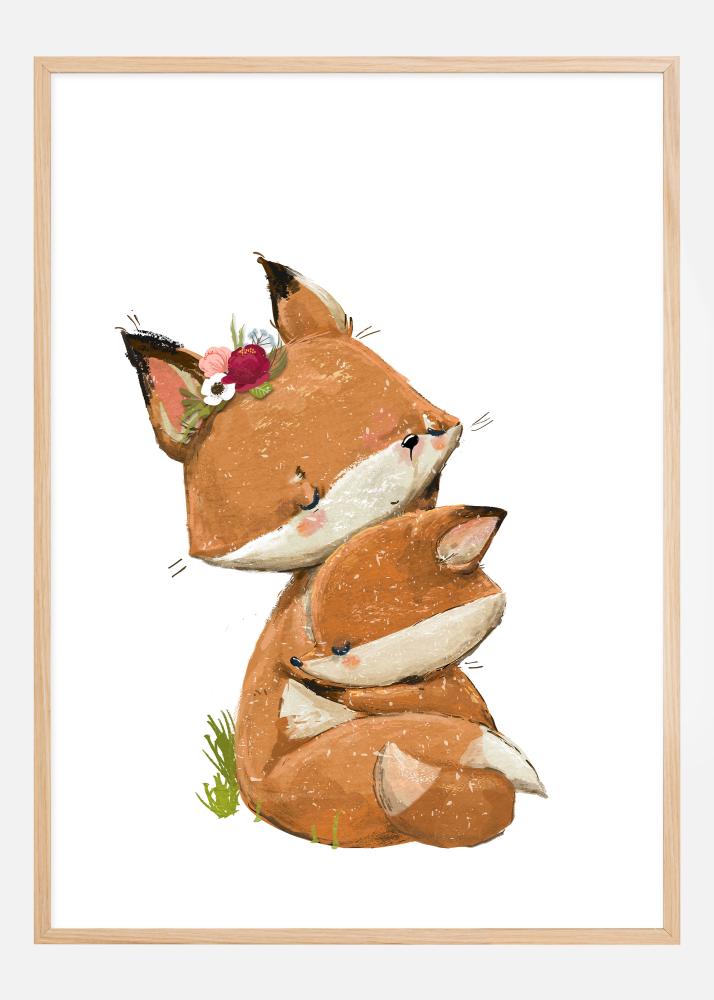 Ponovno opredelite občutek nežnosti s to lepo plakatno sliko, ki prikazuje mater lisico, ki v nežnem objemu objema svojega mladega otroka. Topli odtenki lisičinega kožuha skupaj z nežnimi cvetovi, postavljenimi na glavo, ustvarjajo podobo, ki je tako srčna kot estetsko privlačna. Ta ilustracija ujame bistvo materinske ljubezni in posebne vezi med staršem in otrokom.