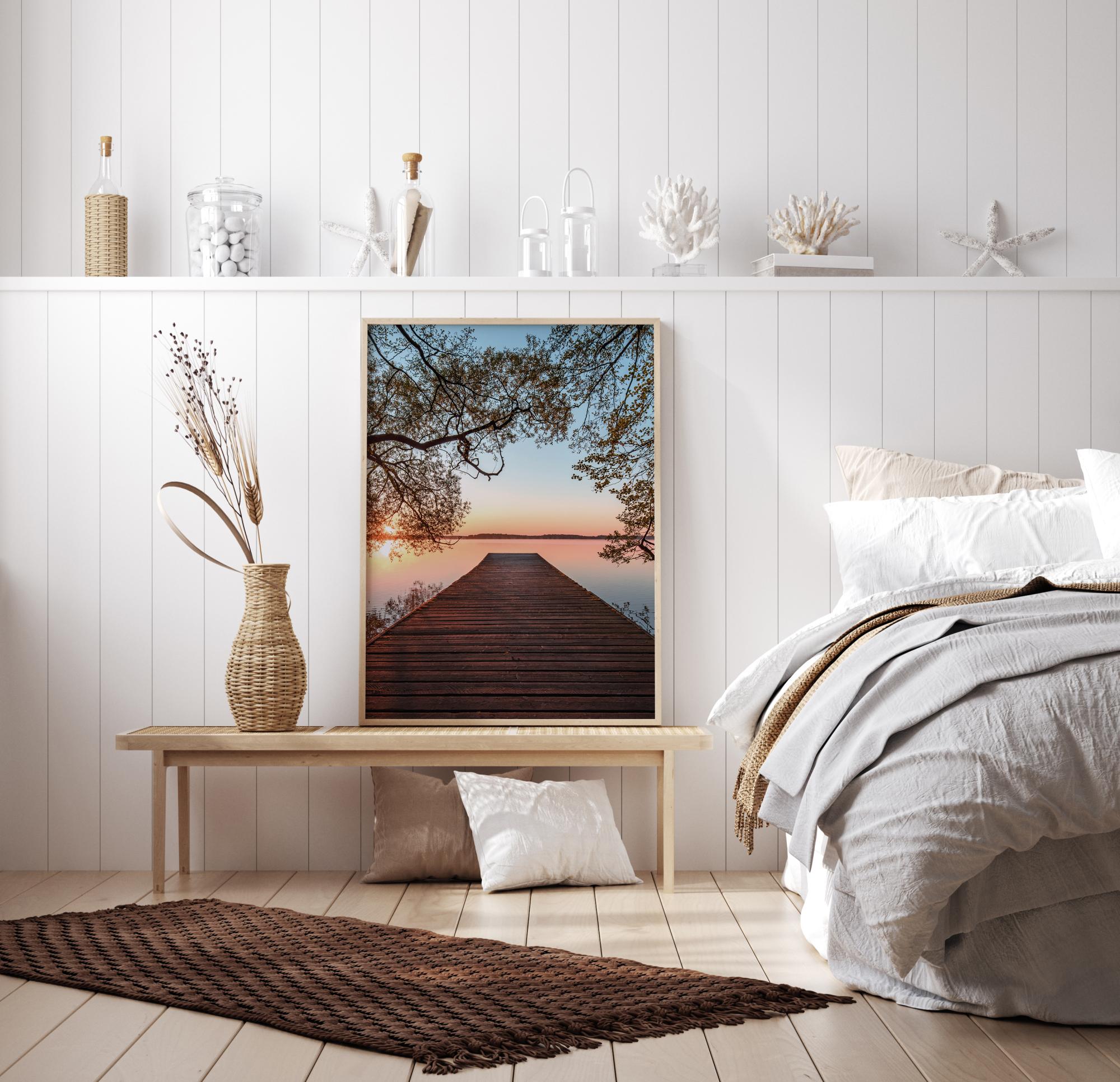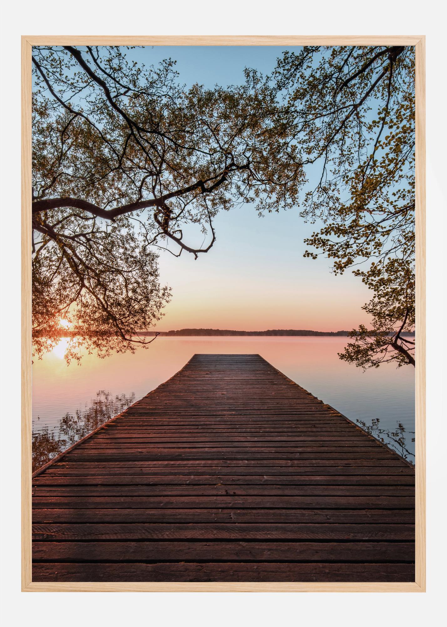 Razpoloženjski plakat s pomolom, ki vodi čez jezero ob svetlem dnevu. Drevesne veje uokvirjajo pomol, ki ga vodi proti mehko modri in breskovo obarvani jezeri in nebu. Občutite svobodo, ko ga prinesete domov.
