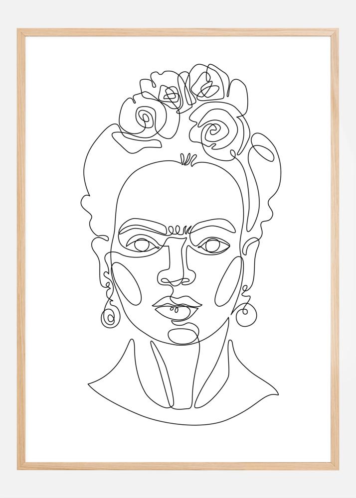 Ta minimalističen plakat prikazuje elegantno črtno risbo ženske figure z elegantnim videzom, okrašeno s cvetjem v laseh in klasičnimi uhanih. Umetniški del je zasnovan v eni neprekinjeni črti, kar daje sodoben pridih tradicionalnemu portretu. Barvna paleta je čista in enostavna, omejena na črne linije na beli podlagi, kar ustvarja prečiščen občutek, ki se odlično prilega v sodoben ali minimalističen dom.