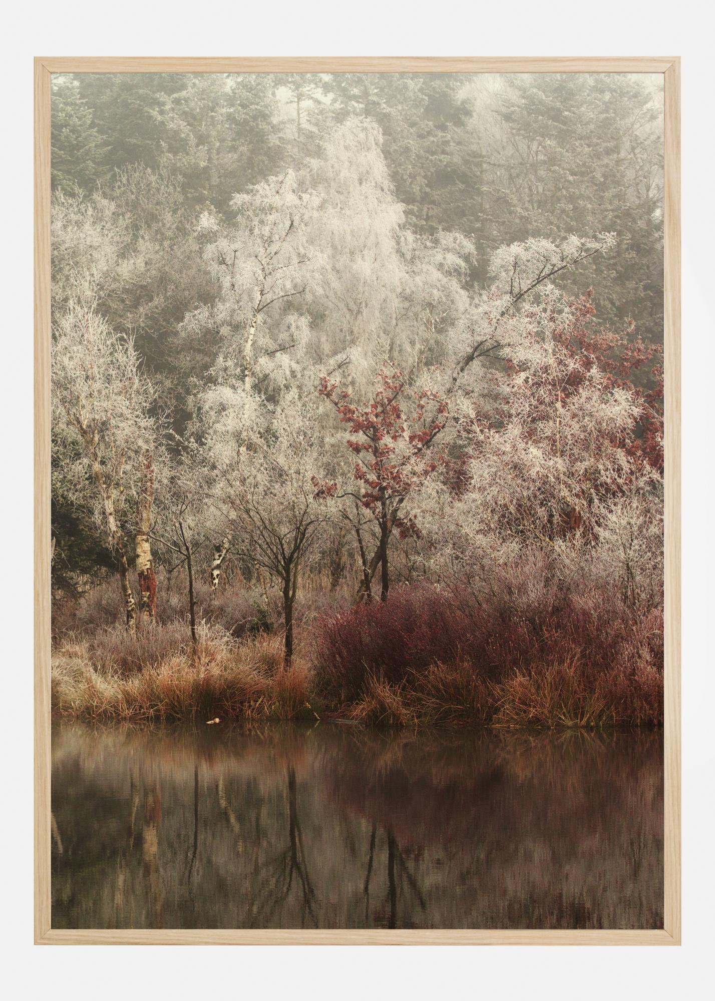 Tih in miren poster z zamrznjeno gozdno pokrajino. Jasno in mirno jezero je v ospredju z temno rdečo travo in zmrznjenimi drevesi v ozadju. Skoraj lahko začutiš tišino in mir, ki izžarevata iz te čudovite, magične slike.