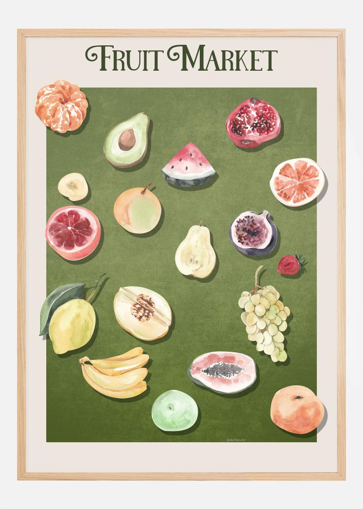 Ta barvita plakat ujame bistvo živahne tržnice s sadjem in je čudovit dodatek naši zbirki dekorativne umetnosti. Tiskanje je užitek za oči, saj prikazuje vrsto sočnih sadežev na bogatem zelenem ozadju, kar ustvarja občutek svežine in obilja. Od sončno zrelih citrusov do tropskih pridiha avokada in granatnega jabolka, to delo ponuja vizualno pojedino, ki tako navdihuje kot osvetljuje. Vsak sadež je upodobljen z detajli, ki poudarjajo njihove edinstvene teksture in oblike, kar naredi ta poster nujen za vse, ki cenijo naravno umetnost.