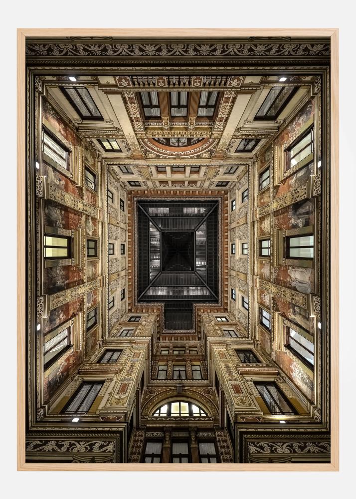 Plakat za notranjost z motivom Galleria Sciarra in njeno čudovito arhitekturo. Predstavljajte si, da ste v stavbi, gledate v strop in vidite čudovito izbiro oken in zapletene vzorce. Odnesite to potovanje s seboj domov.