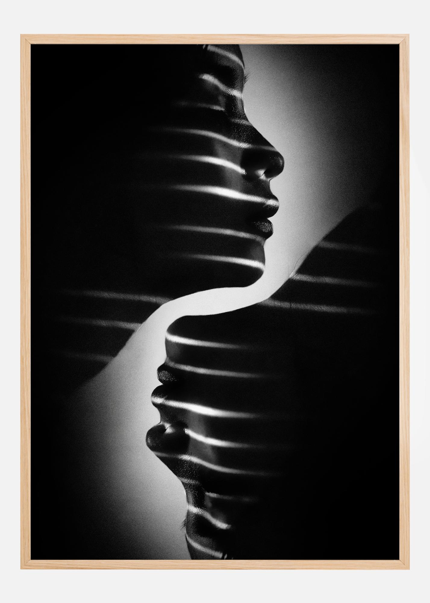 Plakat z dramatičnim dvojnim portretom dveh obrazov v profilu. Trakovi svetlobe dramatično osvetljujejo te temne obraze, medtem ko obdajajoča svetloba zadaj ustvarja avro. Obesite ga na belo steno, da povečate dramatiko tega črno-belega tiska.