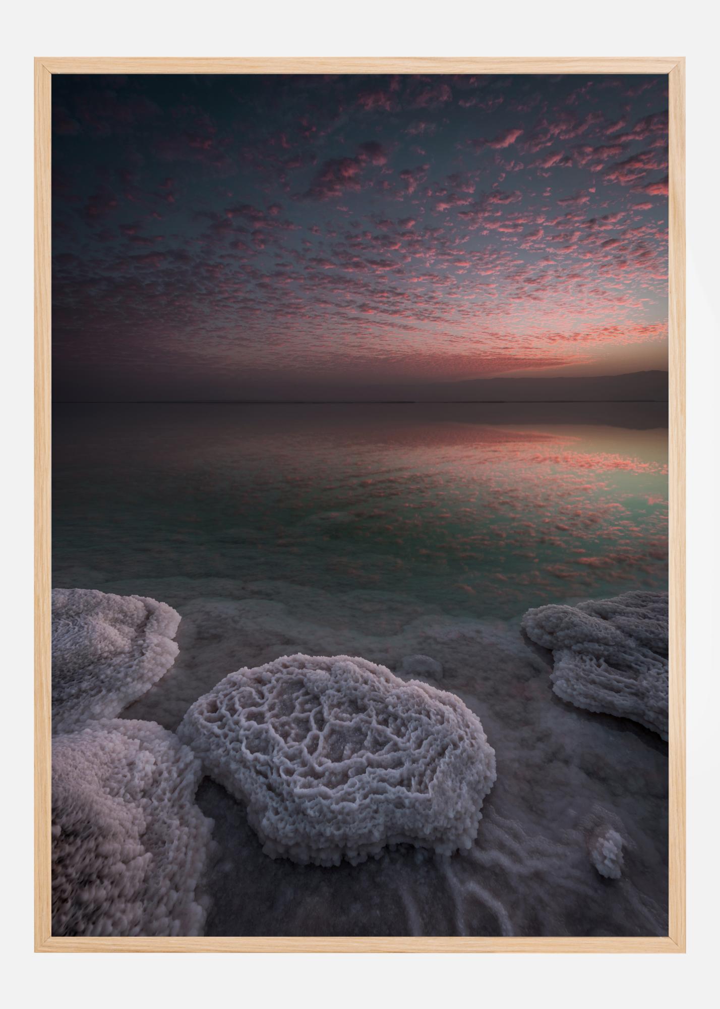 Čudovit poster s prostranim jezerom. V ospredju so se oblikovali veliki kristali soli, ki ustvarjajo fantastične naravne vzorce. Jezero se razteza proti obzorju, medtem ko dramatično rdeče in modro nočno nebo prispeva k čarobnemu občutku na tej sliki.