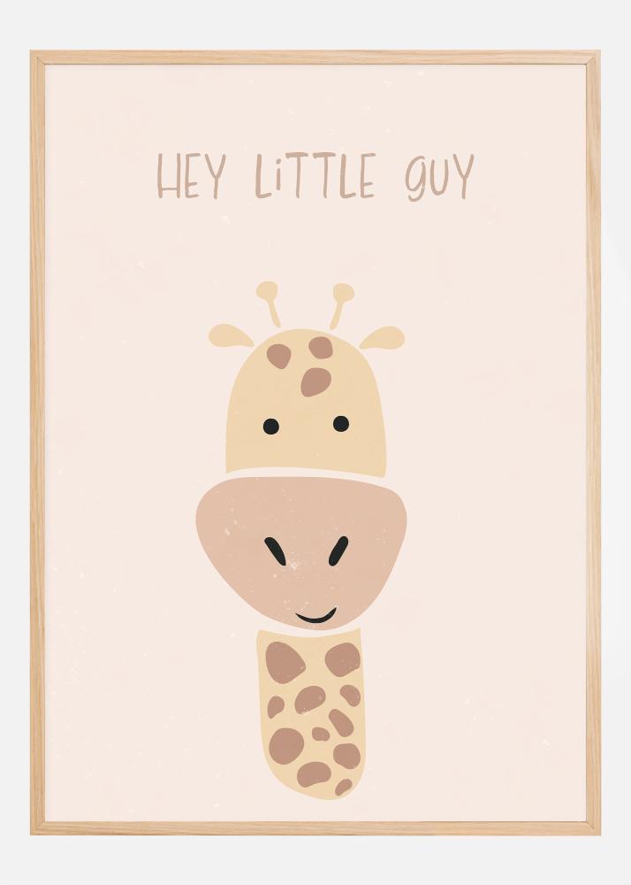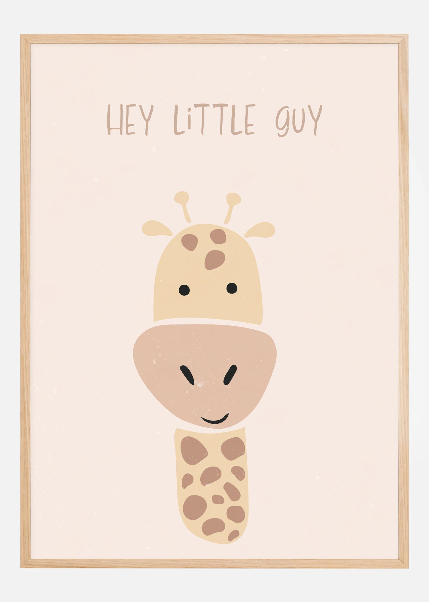 Ta očarljiv plakat z besedilom "HEY LITTLE GUY" in ilustracijo žirafjega mladiča je popolna stenska dekoracija za otroško sobo ali igriv pridih v katerem koli drugem svetlem prostoru. Motiv je značilen po nežnih barvah, kot je nežno roza v ozadju in toplih bež ter rjavih tonih v žirafinem risanem liku. Risana žirafa z enostavnim in otrokom prijaznim dizajnom nosi velik nasmeh in prijazne oči, kar ustvarja takojšnjo povezanost in prispeva k veselemu in gostoljubnemu vzdušju.