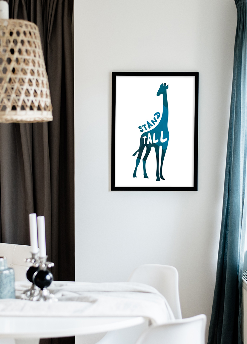 Poster modra kot jezik žirafe ali v tem primeru je cela žirafa te barve. Stiliziran tisk z motivacijsko besedilo - Stand tall - je lepo darilo za nekoga, ki potrebuje malo spodbude, da včasih stoji za svojimi stališči. Grafična ilustracija je lepo združena z drugimi plakati in slikami na steni z določeno temo. Kupite lepo okvir za slike, da uokvirite poster, ki se bo ujemal z ostalo notranjo opremo v domu, da bi ustvarili celosten občutek v prostoru.