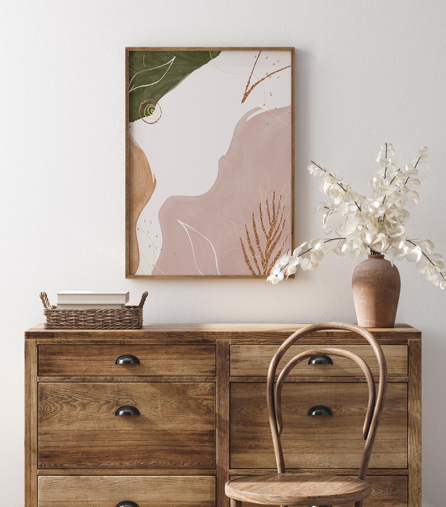 Miren abstrakten plakat z listi in bleščečimi detajli. Veliki, listnati barvni bloki napolnijo ta plakat z majhnimi vejicami in vejami, ustvarjenimi iz bleščečega zlata. Združite to s katero koli pastelno barvo za eleganten dodatek na vaši steni.