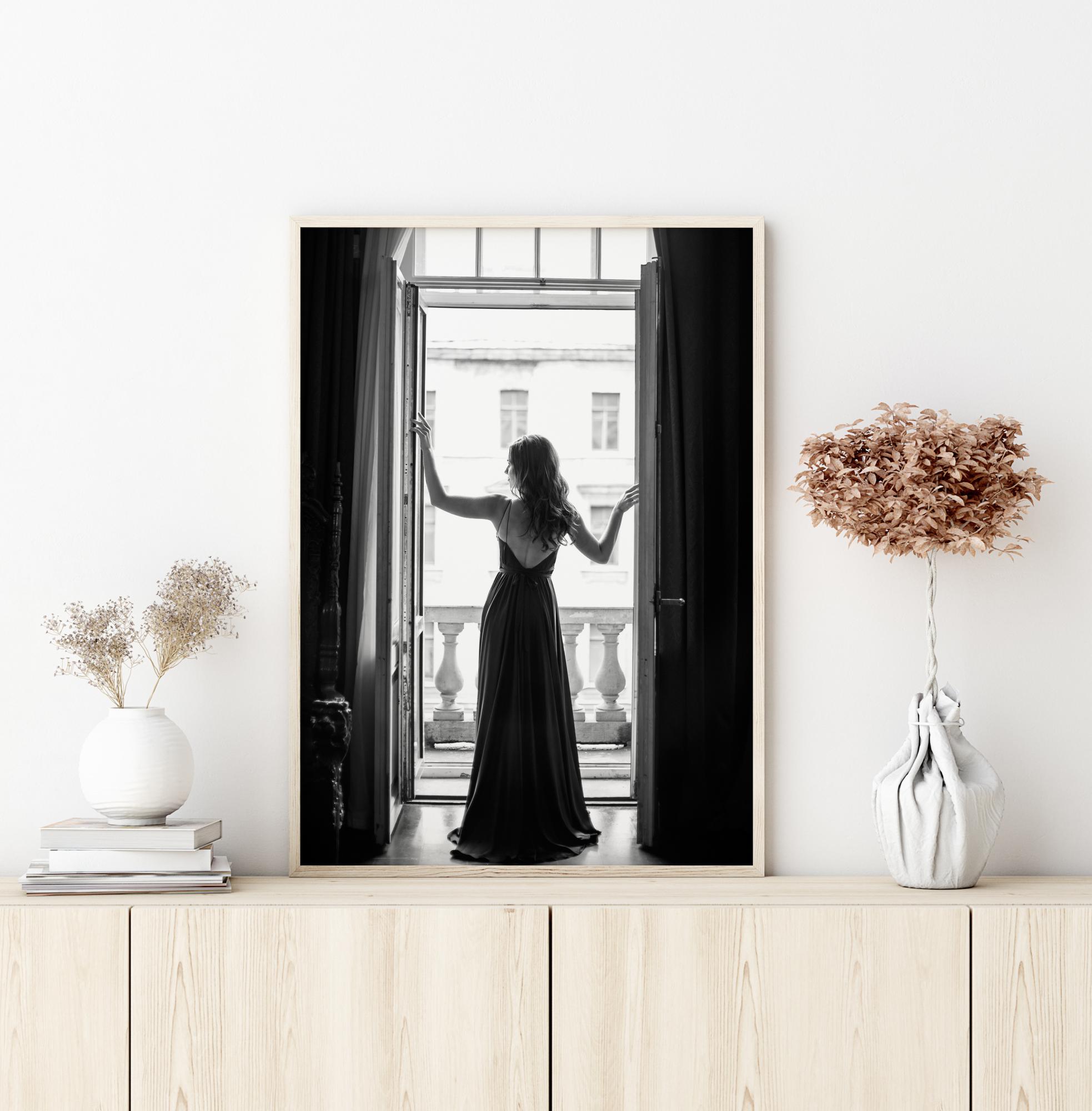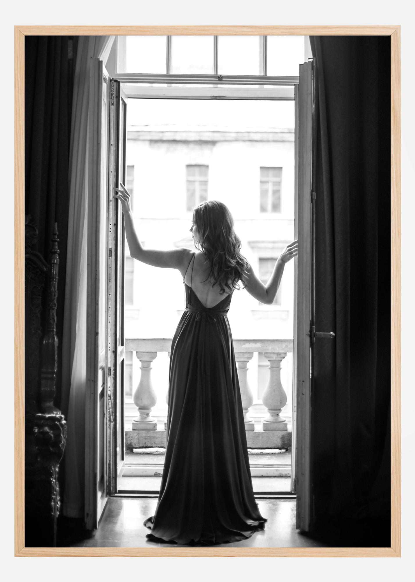 Črno-bela fotografija ženske v dolgi obleki, ki stoji pri široko odprtih balkonskih vratih in gleda proti dnevu. Pred njo se prikazujejo obrabljeni betonski stebri in obrabljena stara fasada. Plakat, ki diha čudovito mešanico lepega in živega v nasprotju s starim in vremensko obrabljenim.