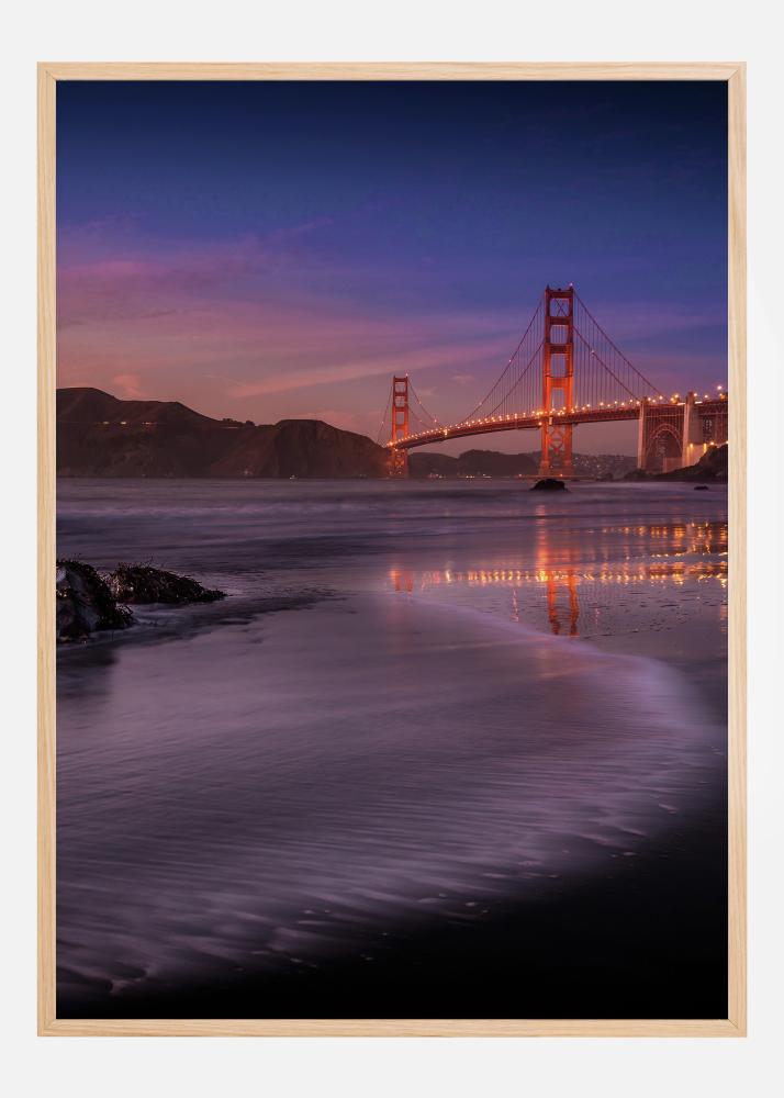 Nočni plakat mostu Golden Gate. Zlate luči osvetljujejo ta znani most in se odsevajo v vodi spodaj. Del obale je v ospredju, voda vodi oko do mostu in čudovitega modro-zlatnega neba, kjer sonce zahaja. Potopite se v to osupljivo nočno sliko.