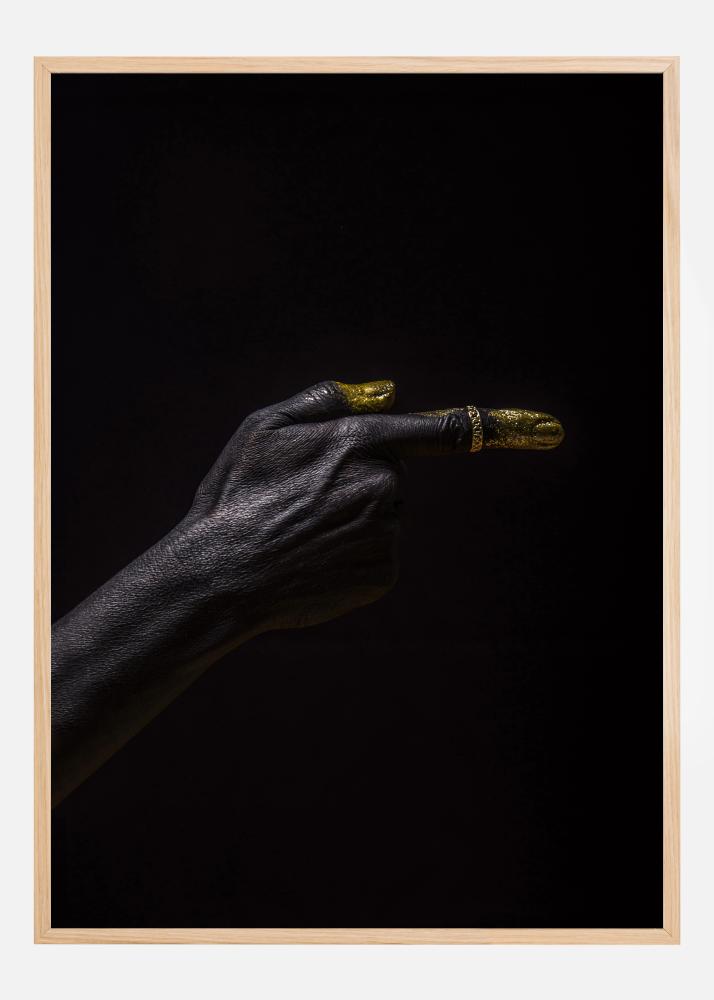 Umetniški plakat z roko, ki kaže s prstom kot pištola. Večina roke je pobarvana črno, prsti pa so pobarvani v zlato do prvega členka. Roka kaže kot pištola v desno in izstopa proti črnemu ozadju. Obešanje tega na kremasto obarvano steno bo dalo resnično dramatičen videz.