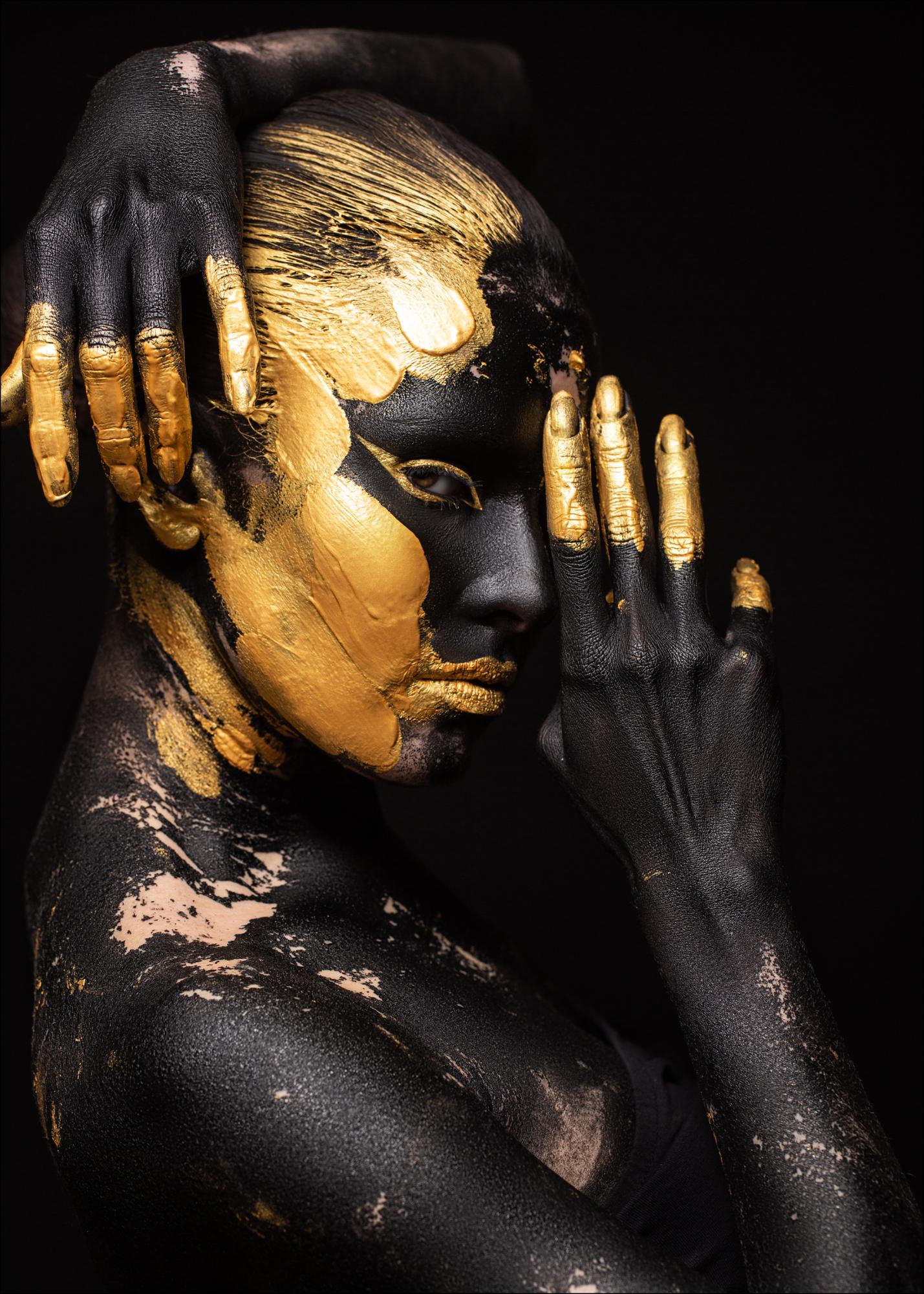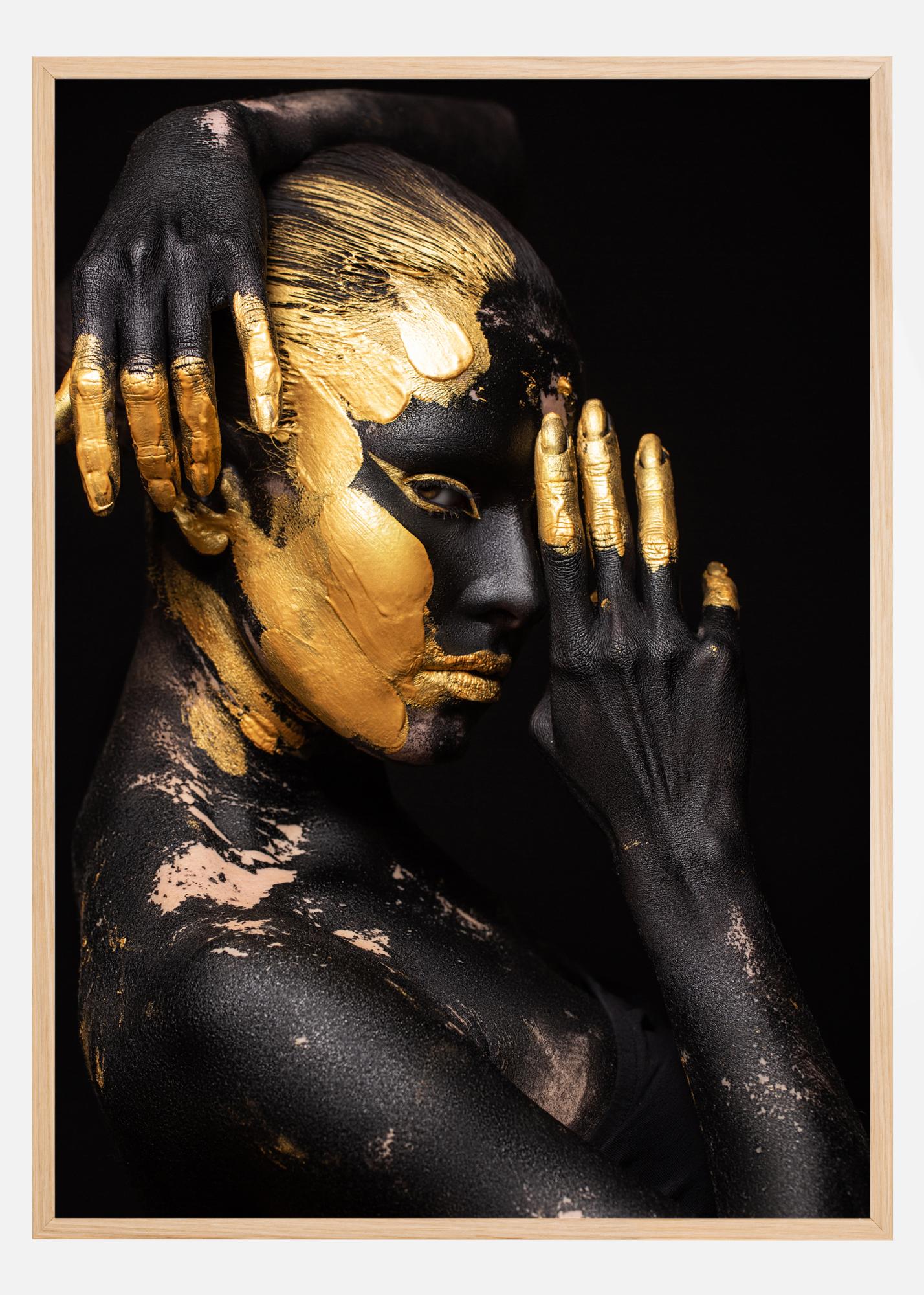 Bleščeč portretni plakat s profilom ženske, ki drži eno roko pred obrazom, druga roka pa je ovita čez glavo. Ženska je naslikana v črni in zlati barvi, da ustvari dramatičen učinek in poudari različne dele njenega telesa, medtem ko te opazuje s kotičkom očesa.