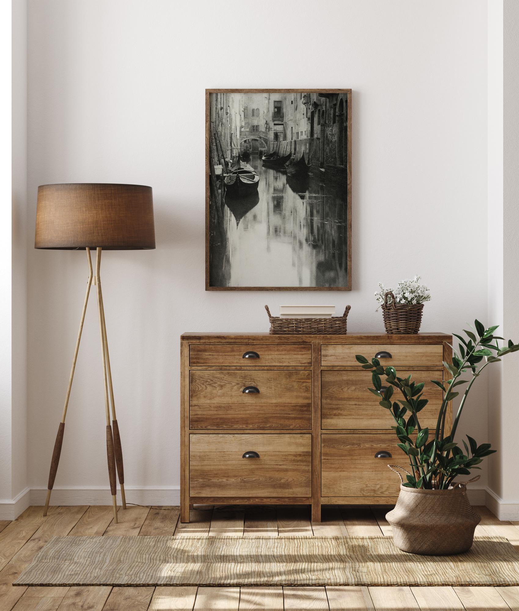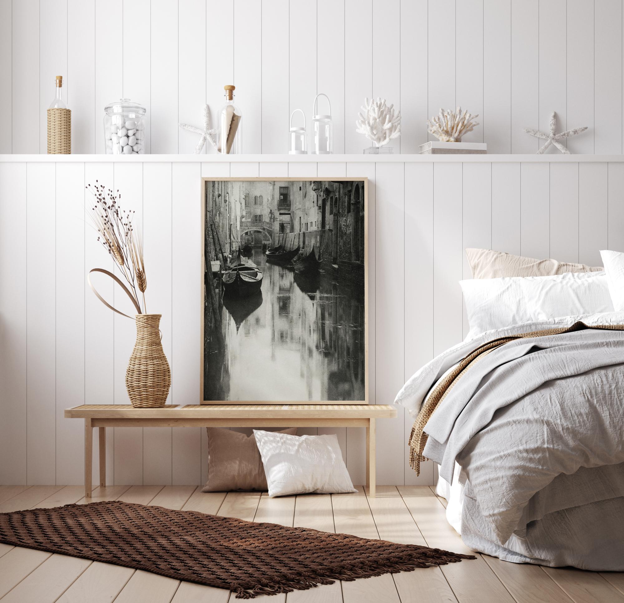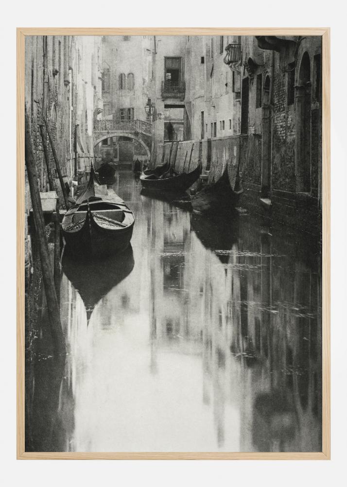 Črno-bela plakat s privezanimi gondolami v kanalu v Benetkah. Čolni mirno ležijo na tihem vodi poleg strmih strani hiš. Slika prežema z mirnostjo in tišino v tem osamljenem delu mesta.